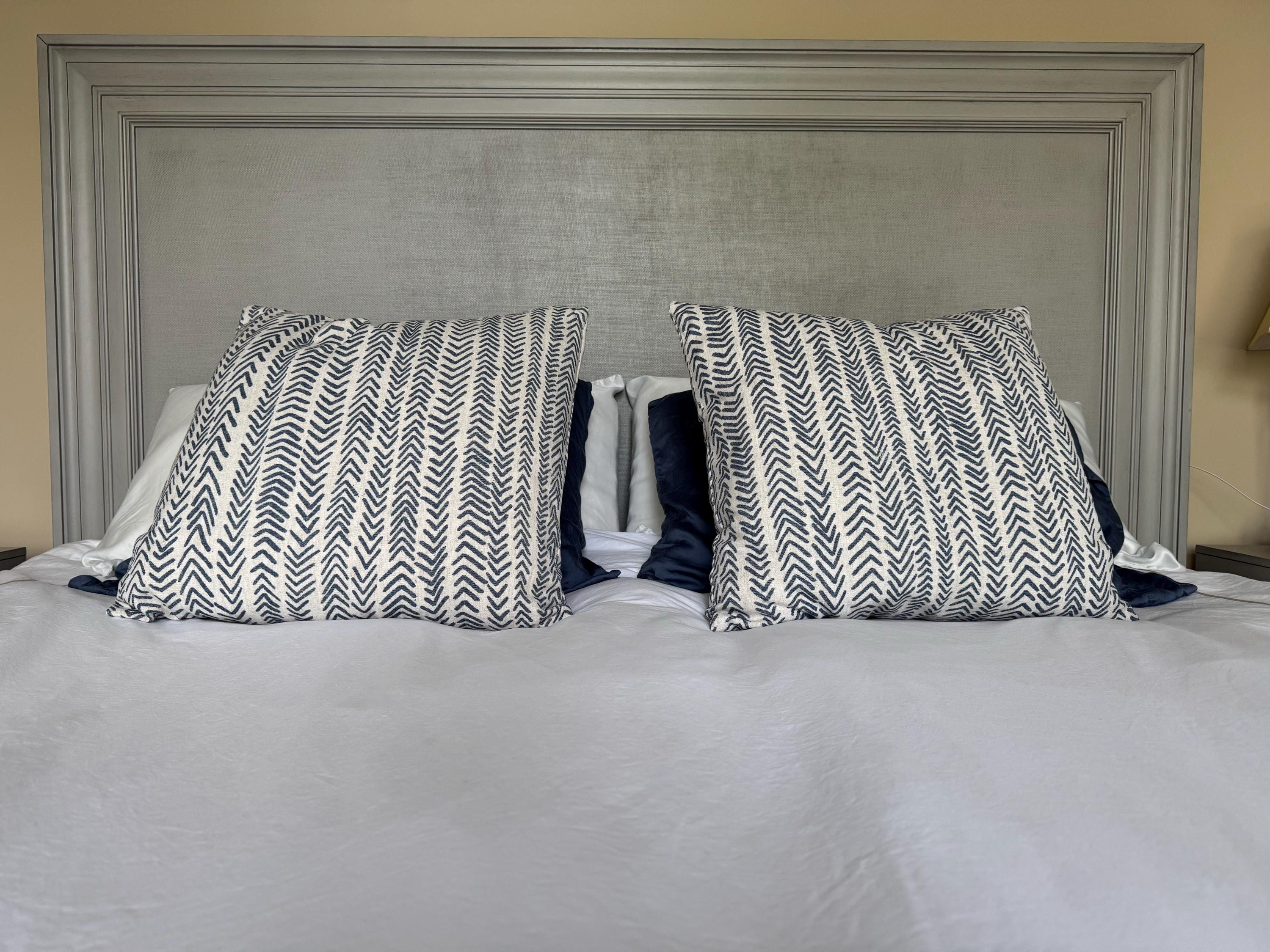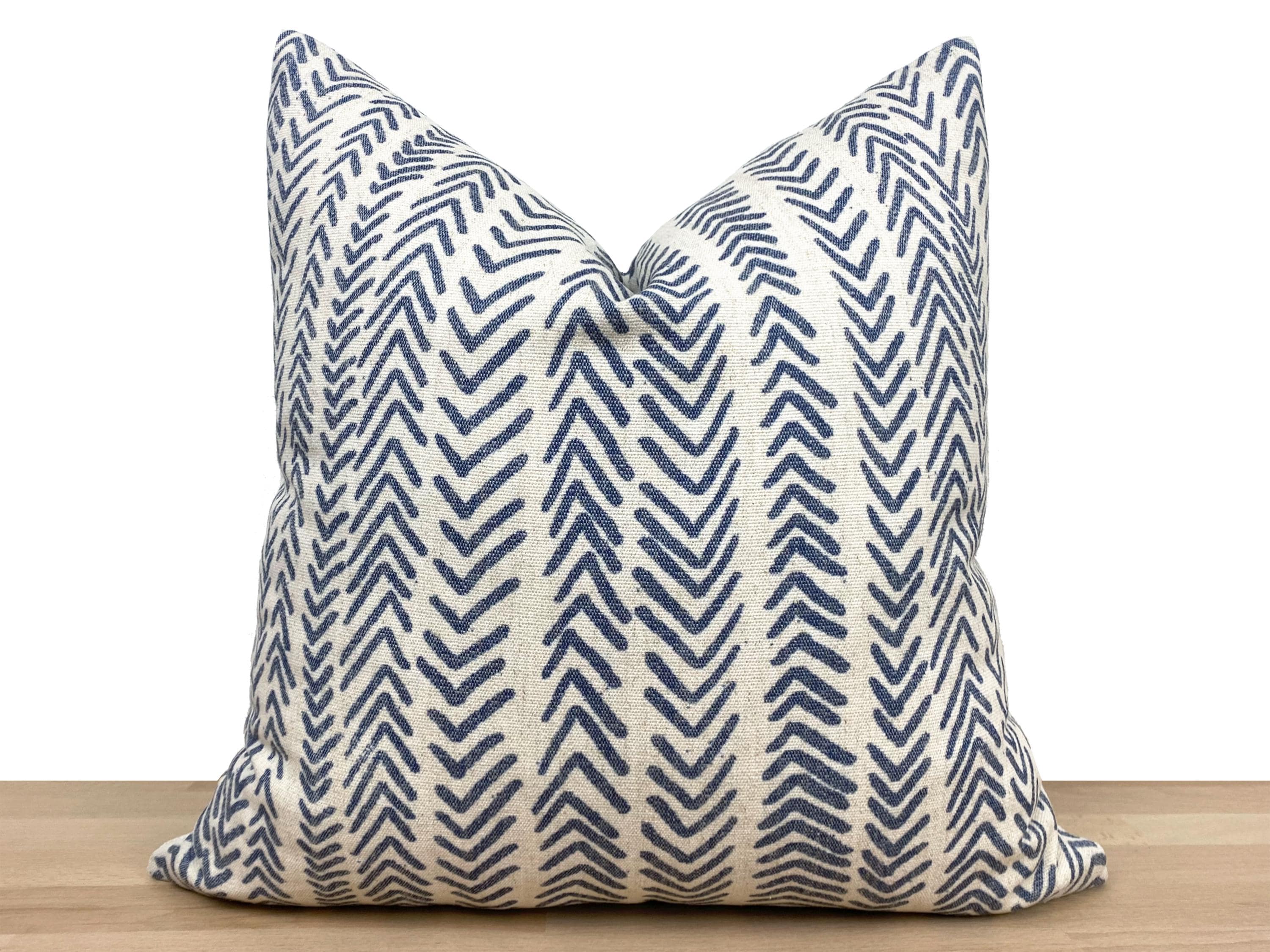 This blue mud cloth pillow cover features a traditional-inspired pattern in indigo blue and off-white, adding depth and cultural charm to any space.
