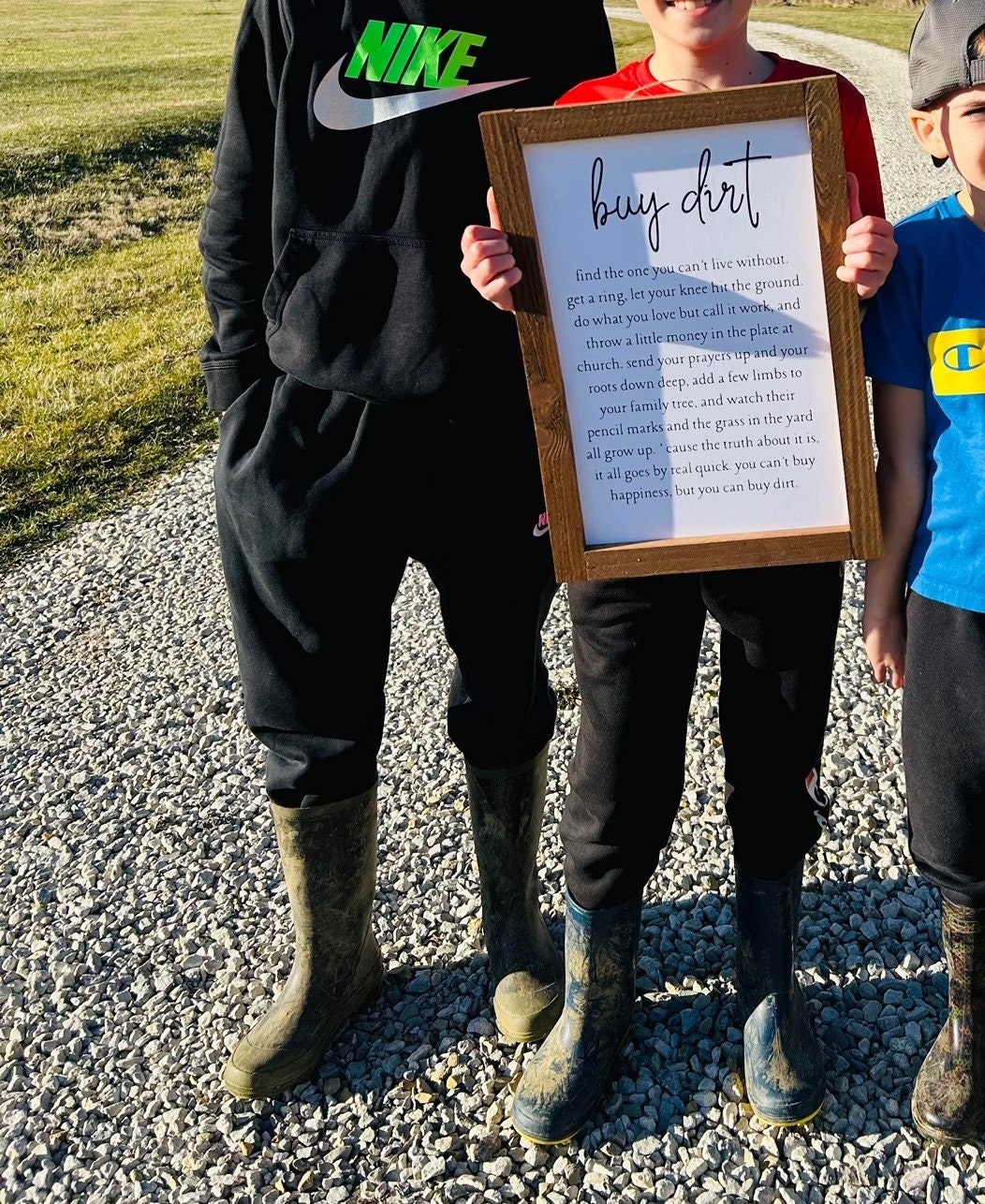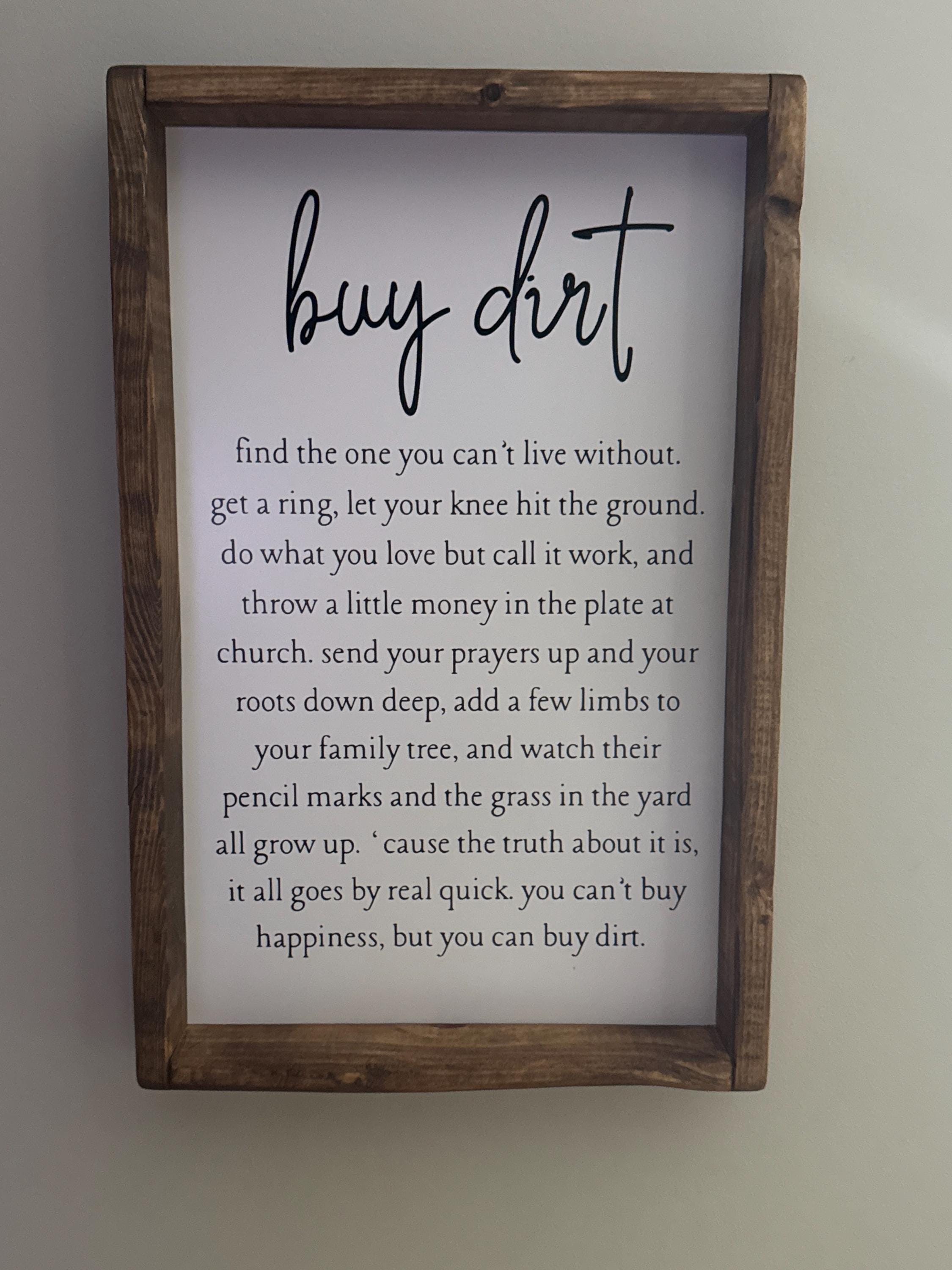 Featuring a crisp white background contrasts with bold black lettering, showcasing the inspiring lyrics: “"Buy dirt, find the one you cant live without. Get a ring let your knee hit the ground. Do what you love but call it work, and throw a little money in the plate at church. Send your prayers up and your roots down deep, add a few limbs to your family tree, and watch their pencil marks and the grass in the yard all grow up. "Cause the truth about it is, it all goes by real quick. You can't buy happiness, but you can buy dirt." These words, a nod to the Jordan Davis and Luke Bryan song, celebrate life’s simple joys—love, faith, family, and hard work.