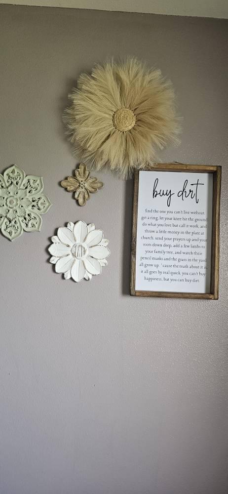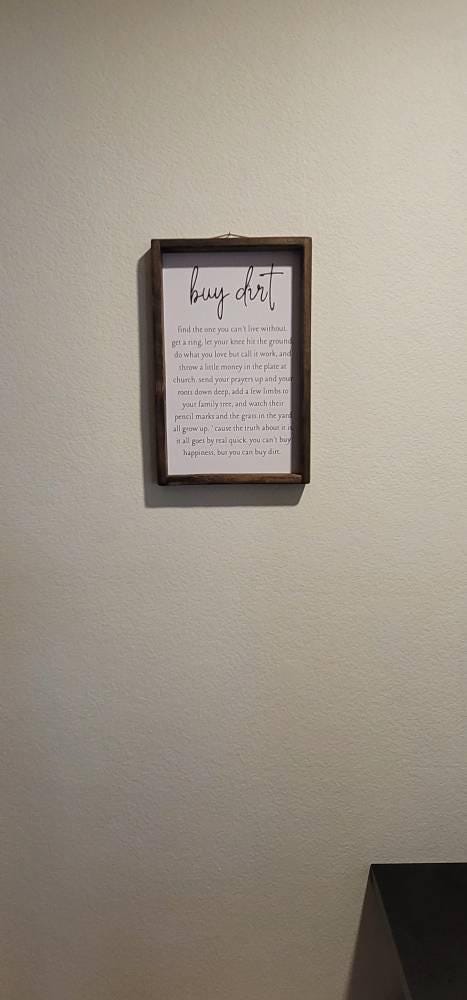 Add a touch of rustic charm to your home with this beautifully crafted “Buy Dirt” framed sign, perfect for those who cherish meaningful, heartfelt decor. Measuring 11.50” x 1.75” x 17.50”, this sign features a distressed wooden frame that complements its farmhouse-inspired design, making it an ideal accent for any living room, bedroom, or entryway.Includes a jute hanger so it will be ready to place on your wall as soon as it arrives at your doorstep. This is a high quality print and made with a wood frame. The wood frame is made using rough cut wood for a true farmhouse feel. Finished in stain "Provincial".