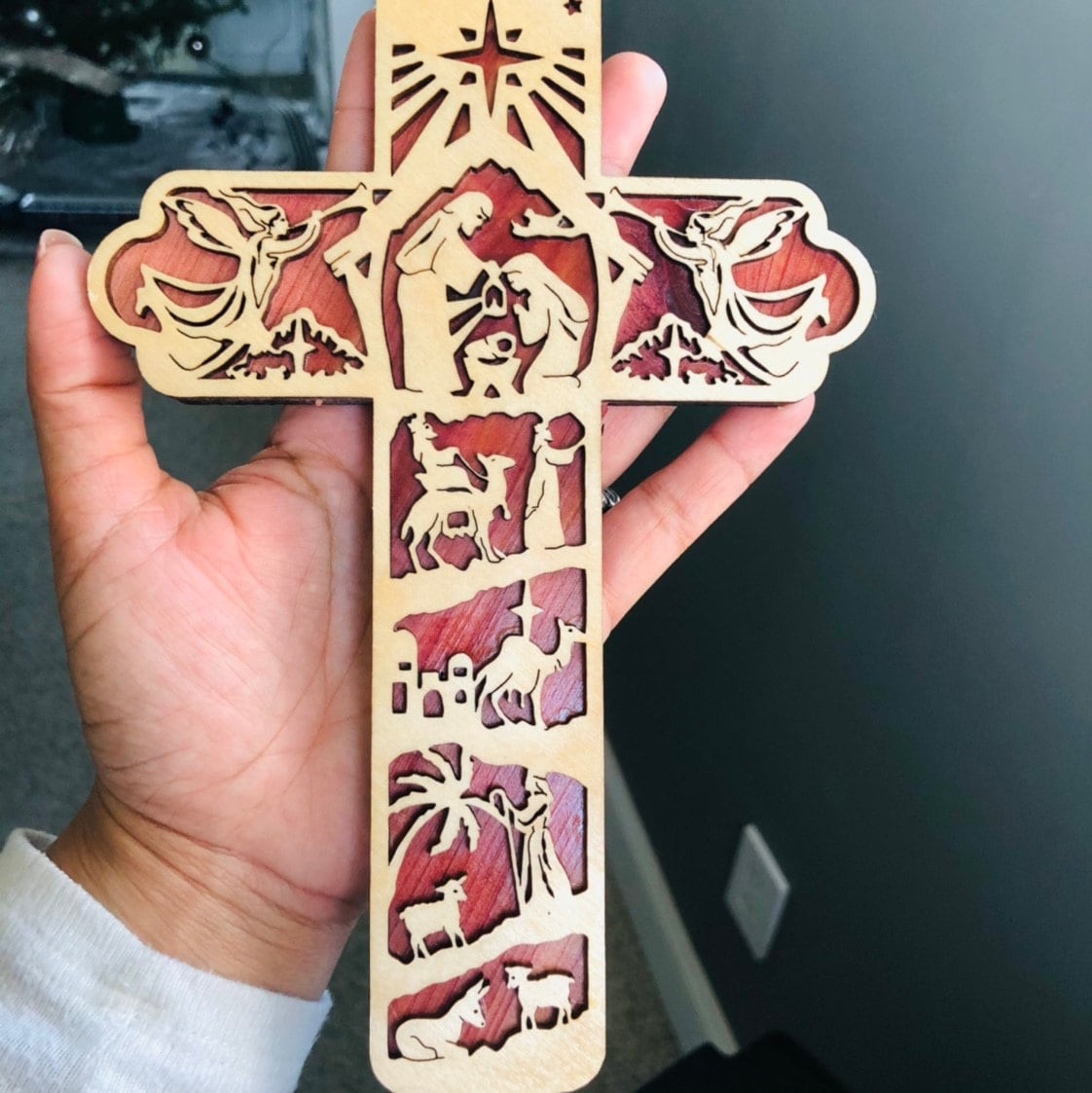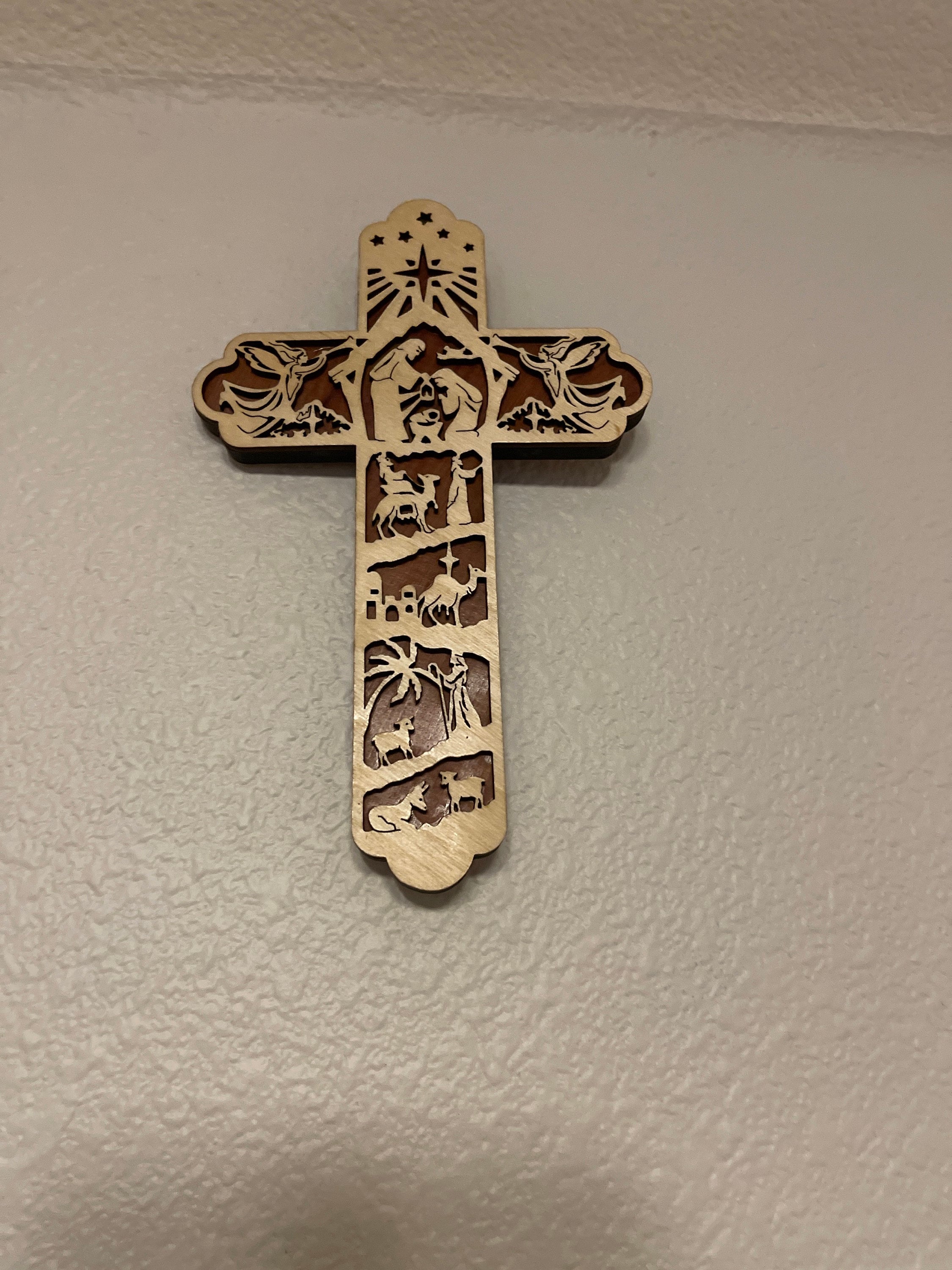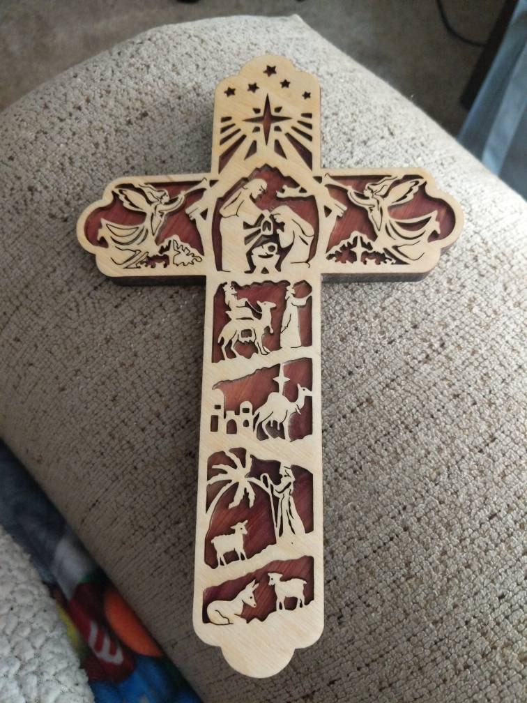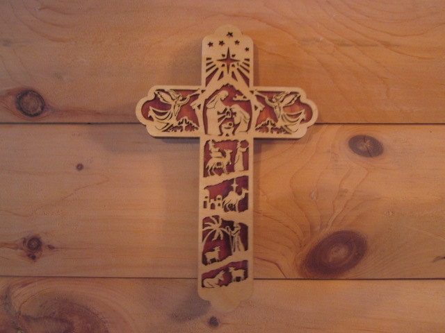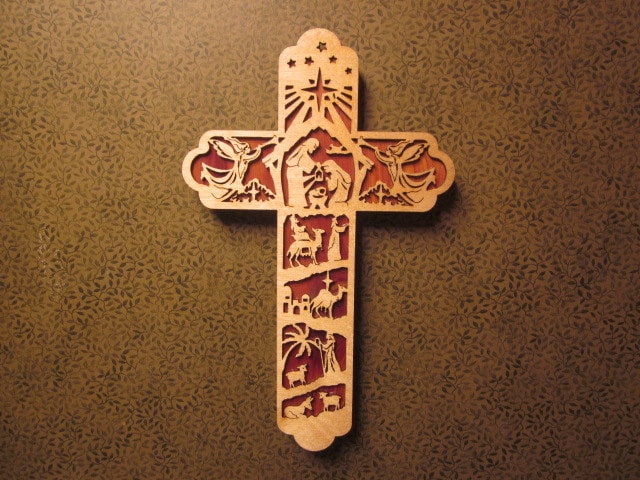 Nativity Cross with intricate cutout designs crafted in contrasting hardwoods. Measures 5.75 inches across by 9.0 inches long by 3/8 inches thick. Hole in back for wall hanging.