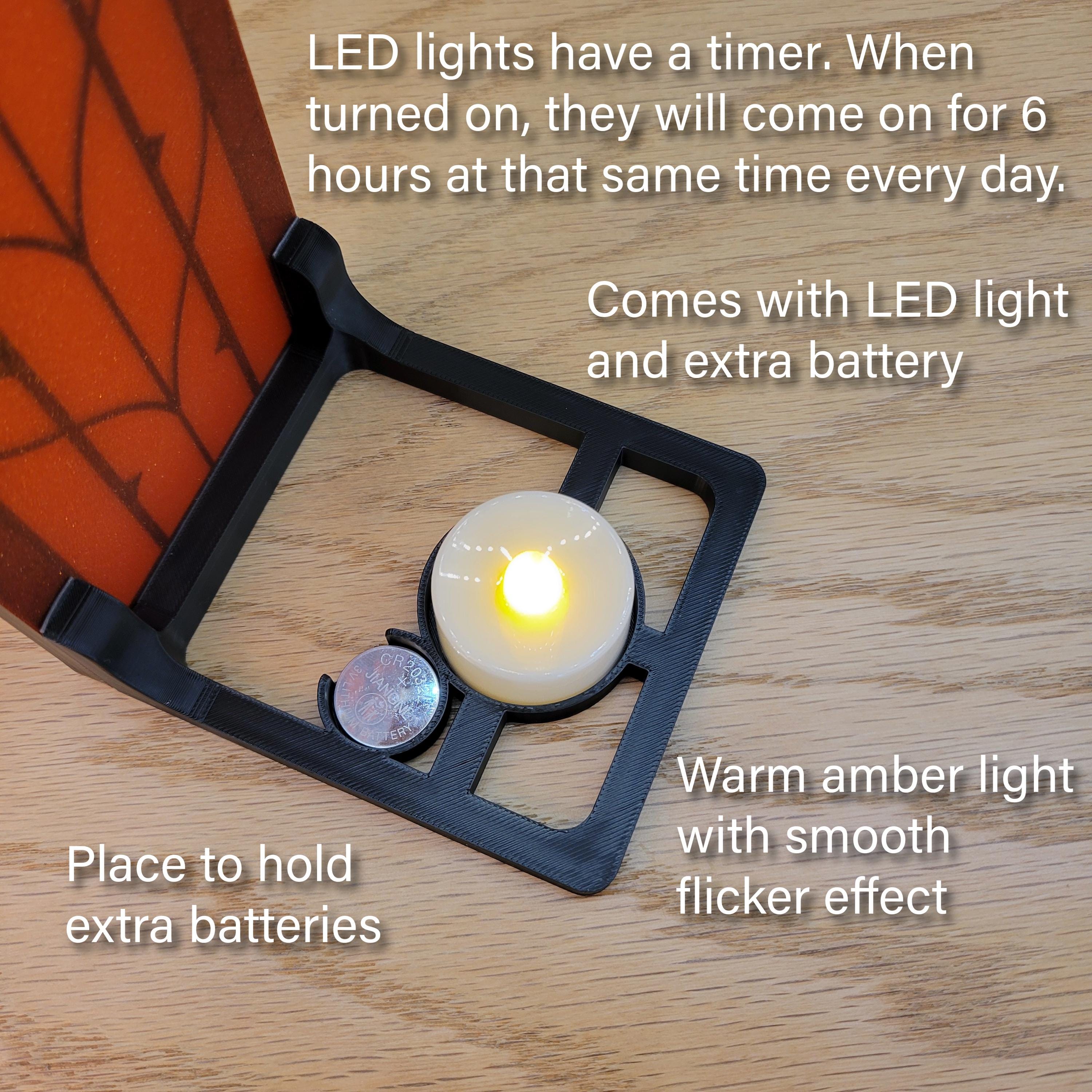 Comes with an LED candle and extra battery. The LED candle has a realistic flicker effect that looks smoother in real life than in the video. It has a 6 hour timer so you don't have to turn it on/off every day. When you turn it on, it will automatically come on for 6 hours at that same time every day. Only use LED lights, do not use real candles.