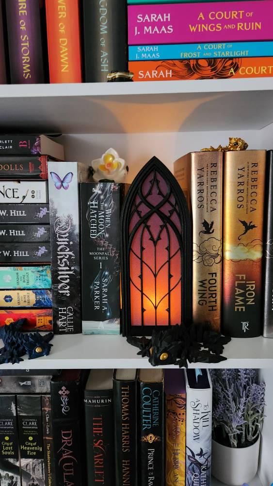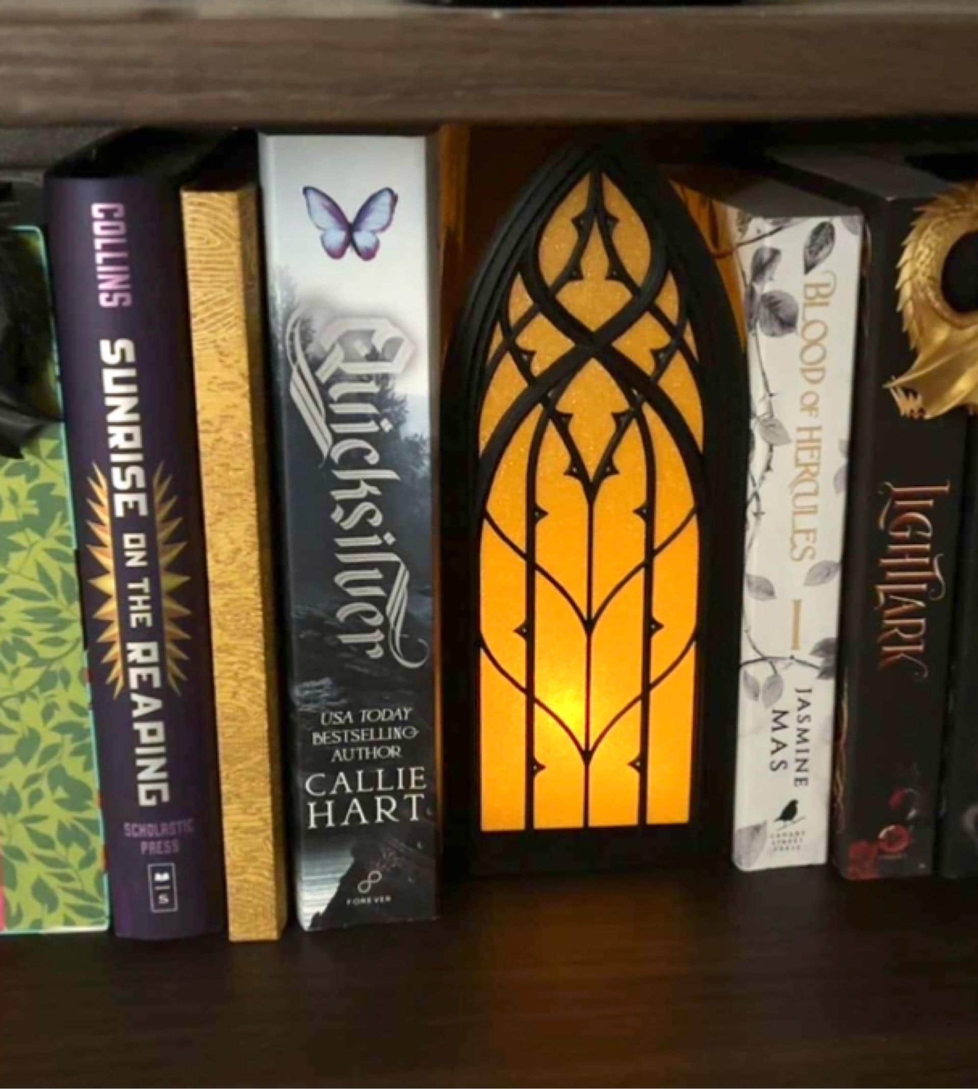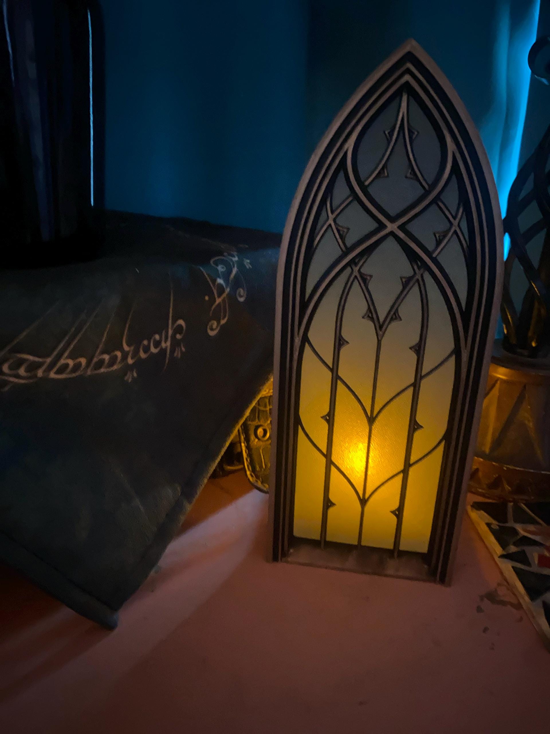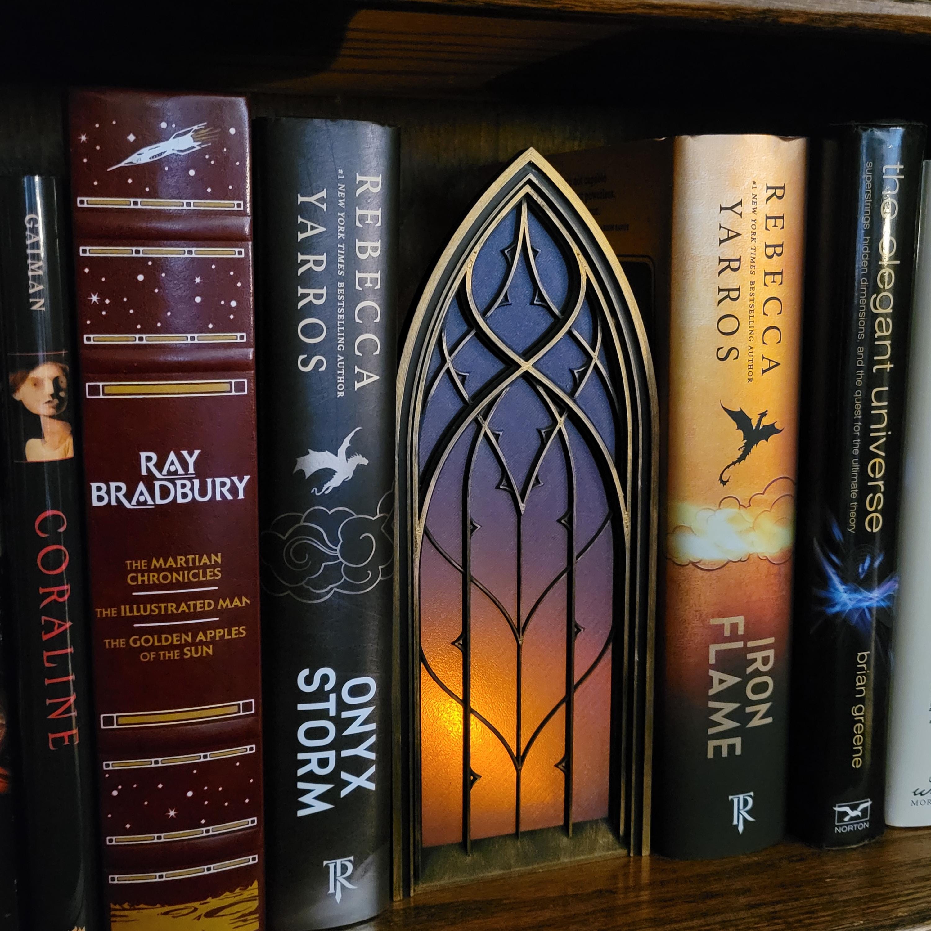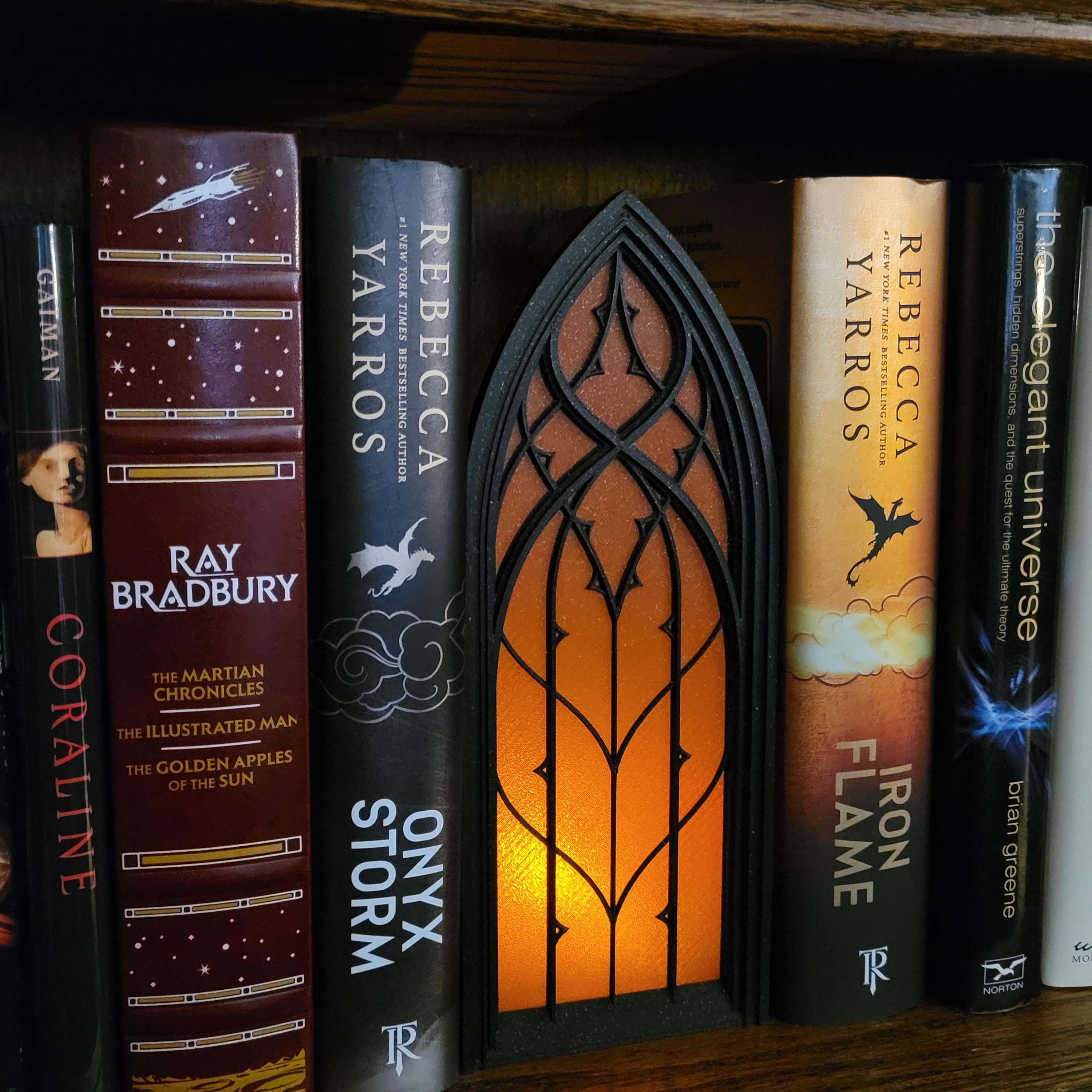This is a book nook I designed inspired by gothic cathedrals and elven style architecture from Lord of the Rings. At night the LED candle shines through the transparent window creating a warm glow like an elven sanctuary right inside your bookcase. Perfect for fans of fantasy, Harry Potter, Fourth Wing, or anyone who wants to add some intrigue to their book collection.