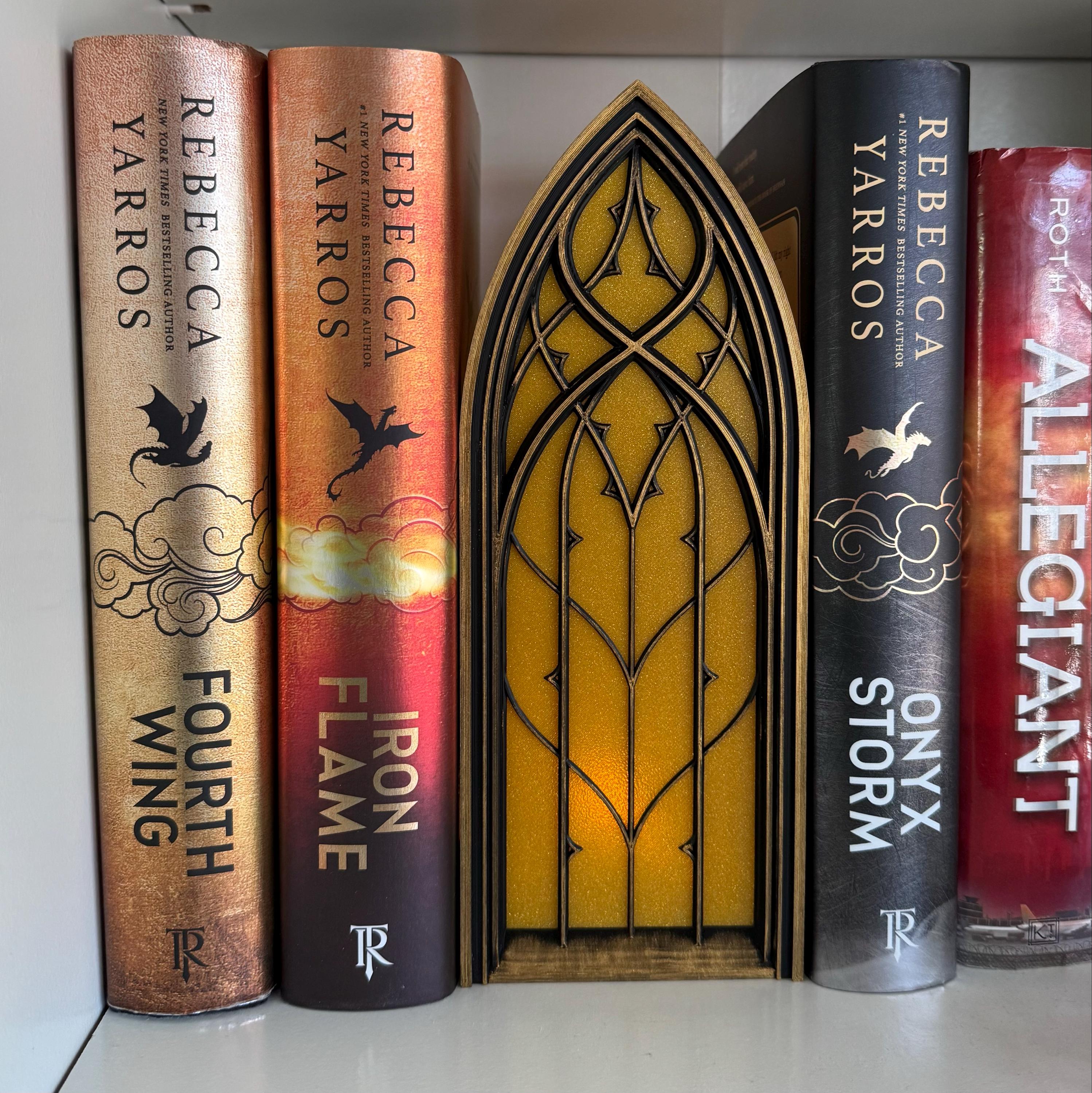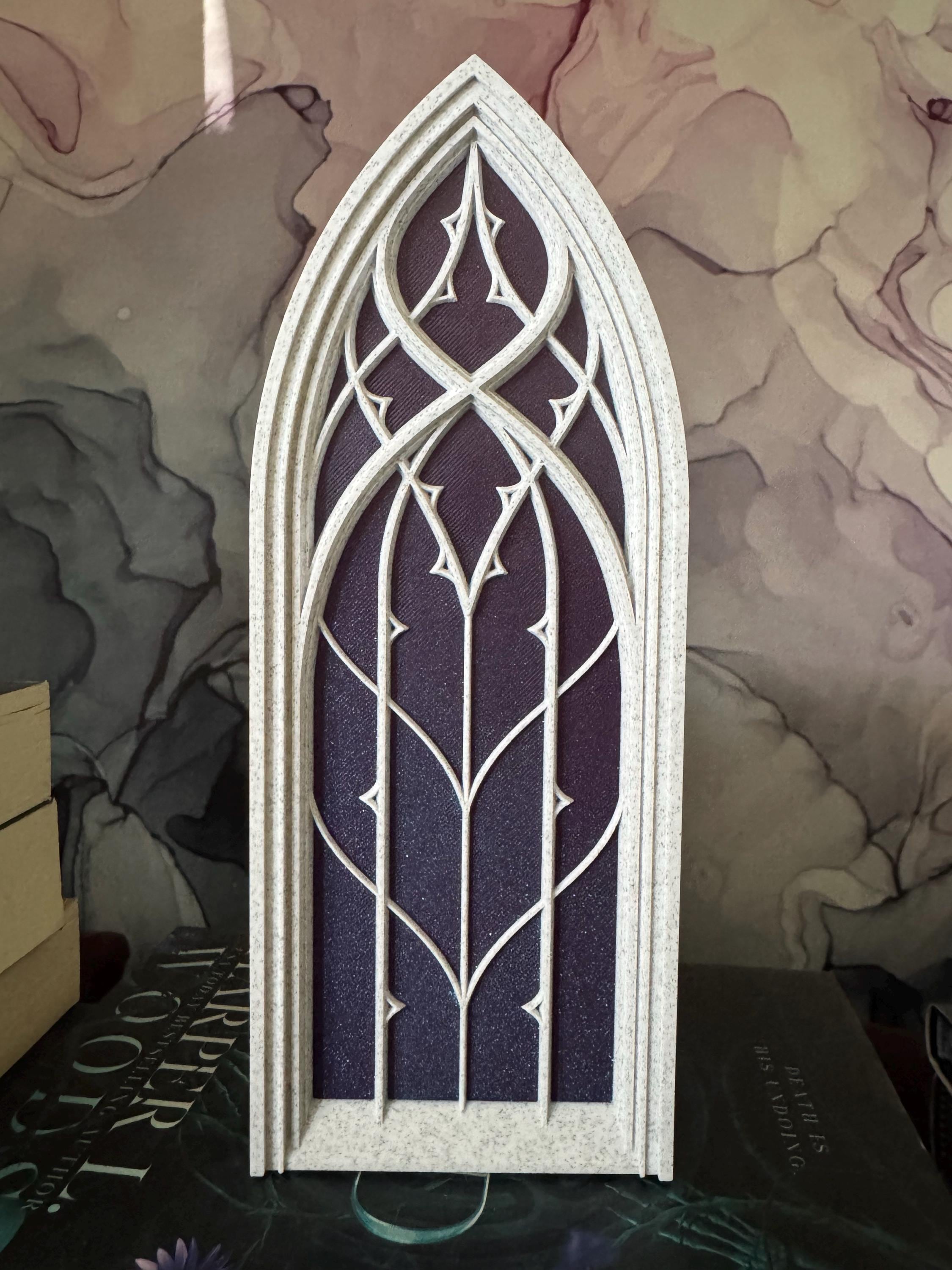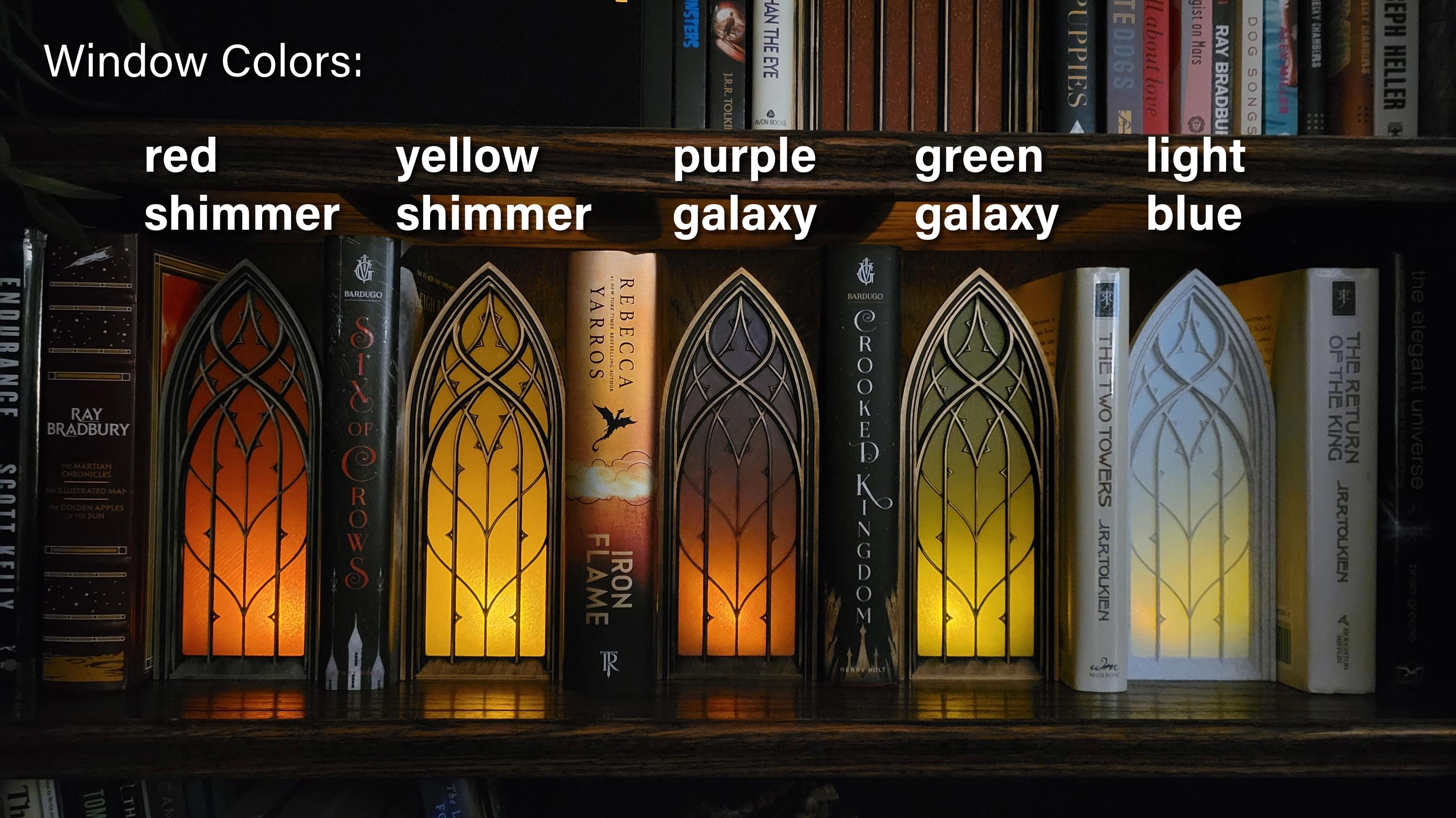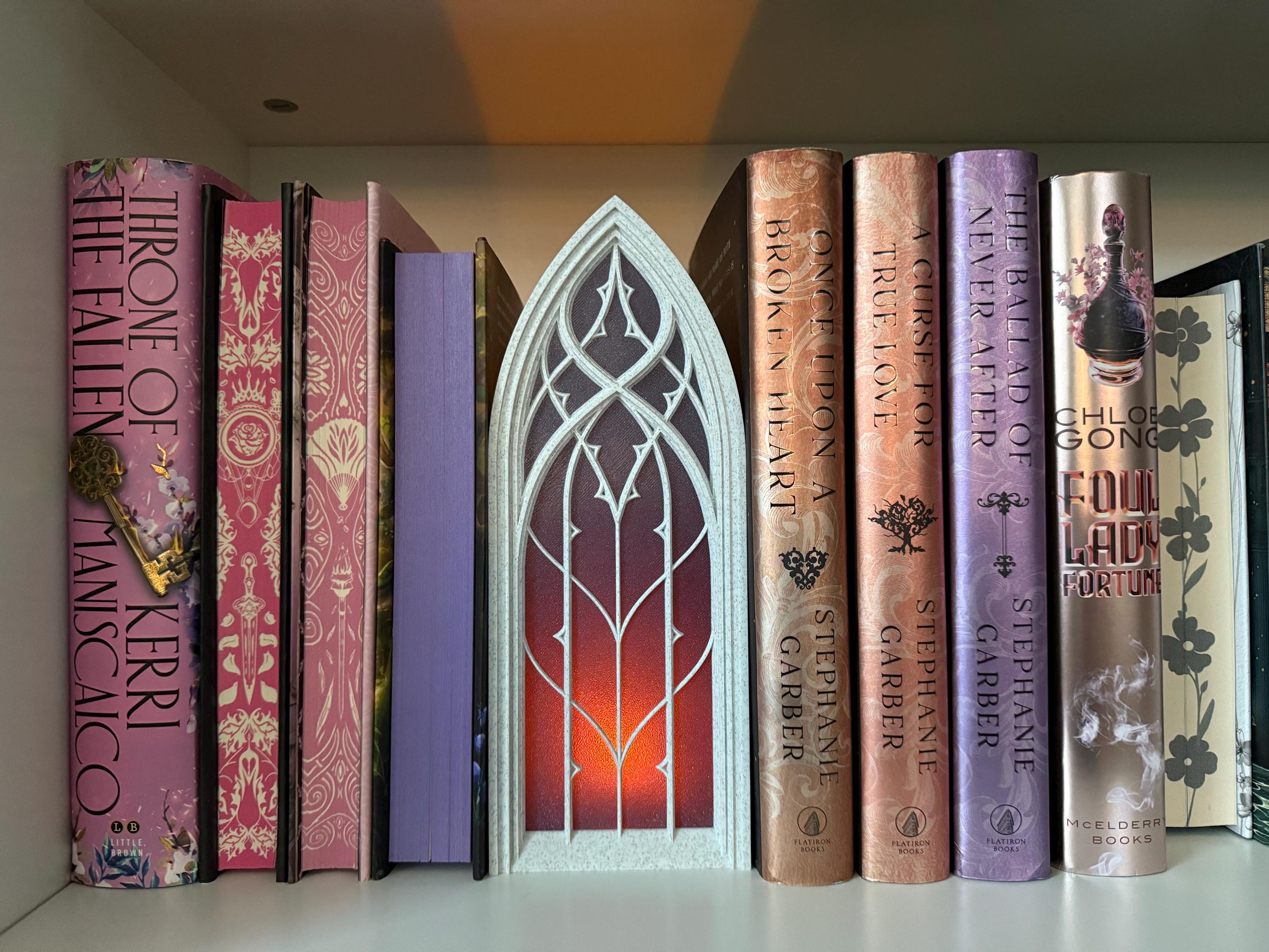 This is a book nook I designed inspired by gothic cathedrals and elven style architecture from Lord of the Rings. At night the LED candle shines through the transparent window creating a warm glow like an elven sanctuary right inside your bookcase. Perfect for fans of fantasy, Harry Potter, Fourth Wing, or anyone who wants to add some intrigue to their book collection.