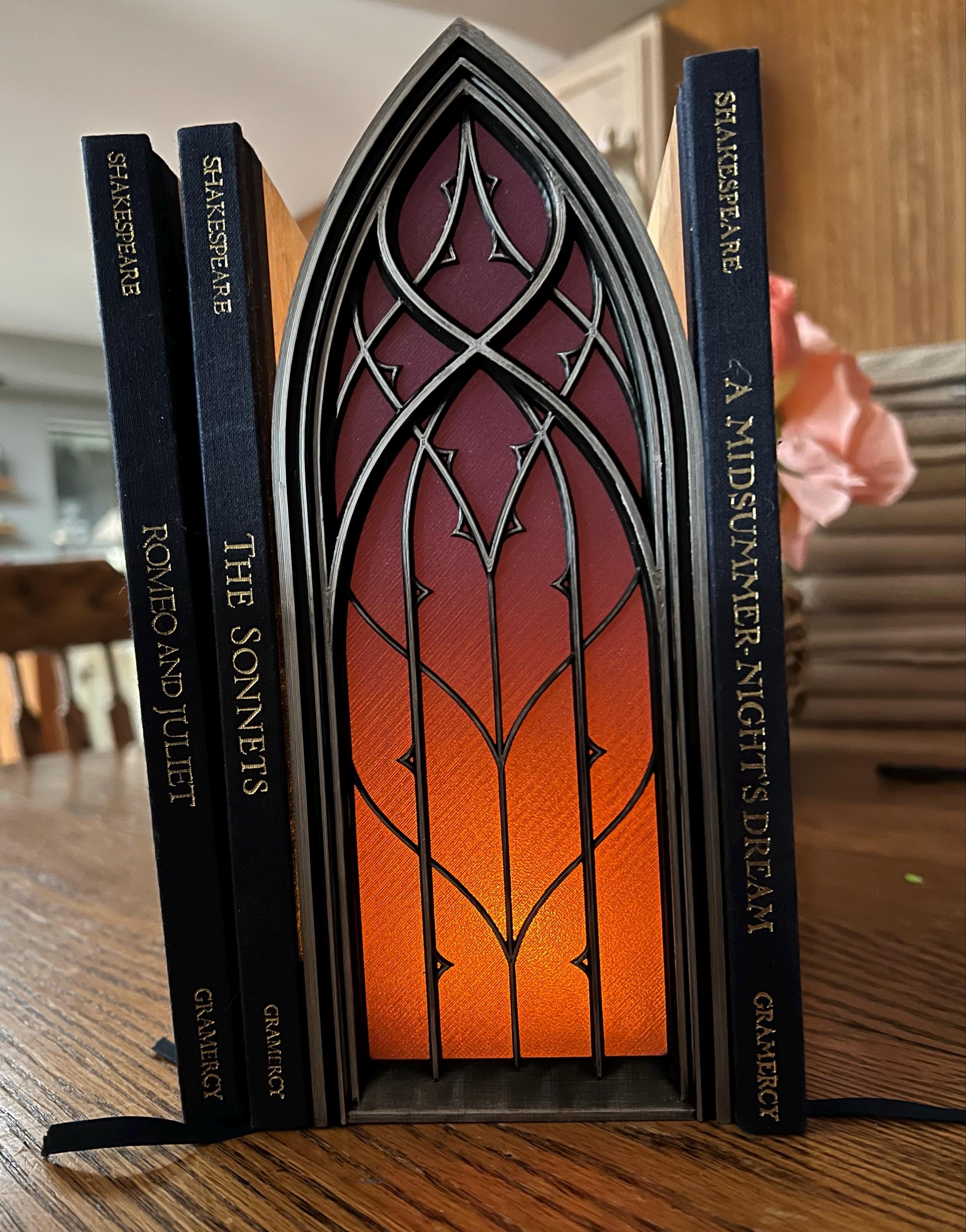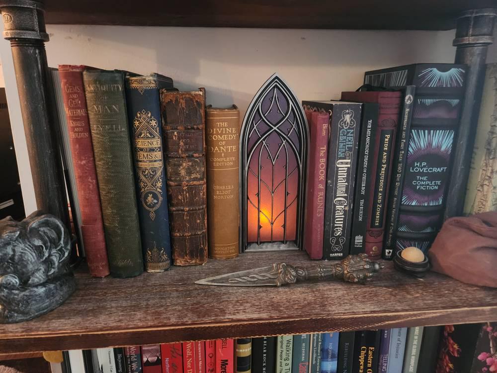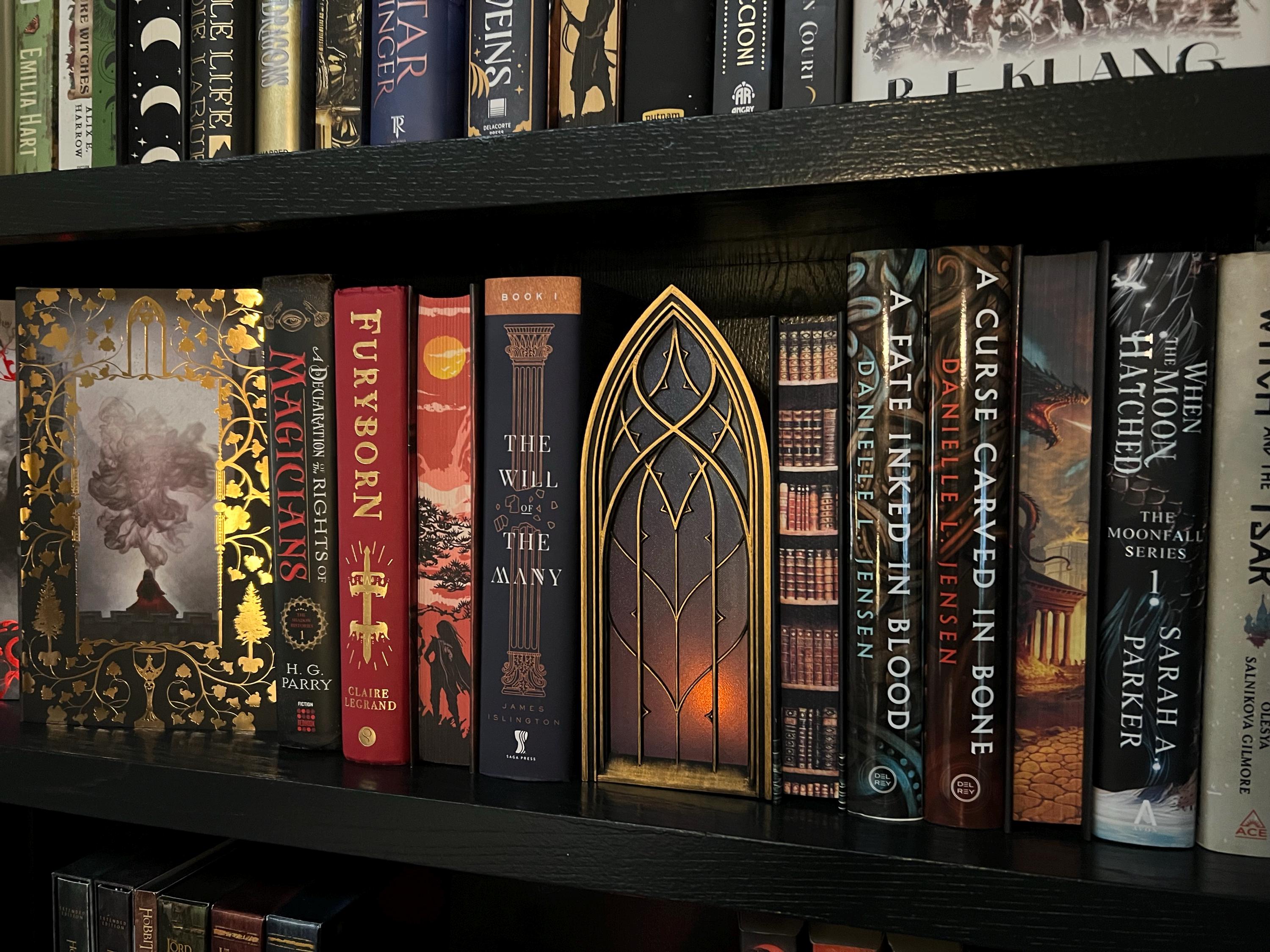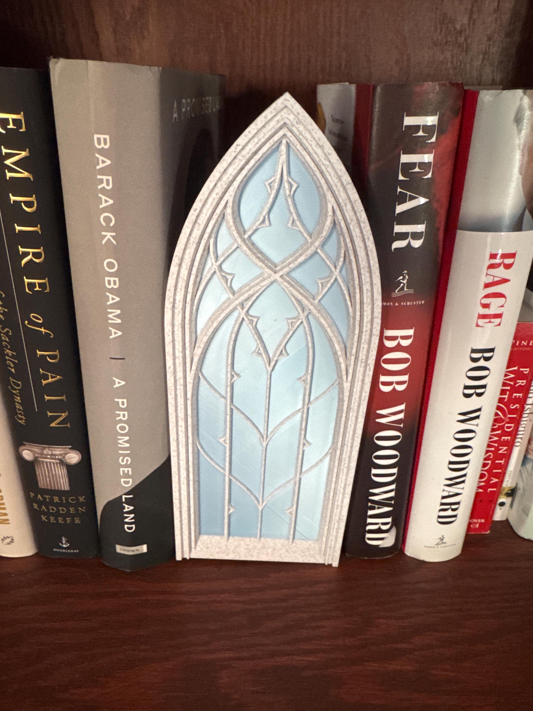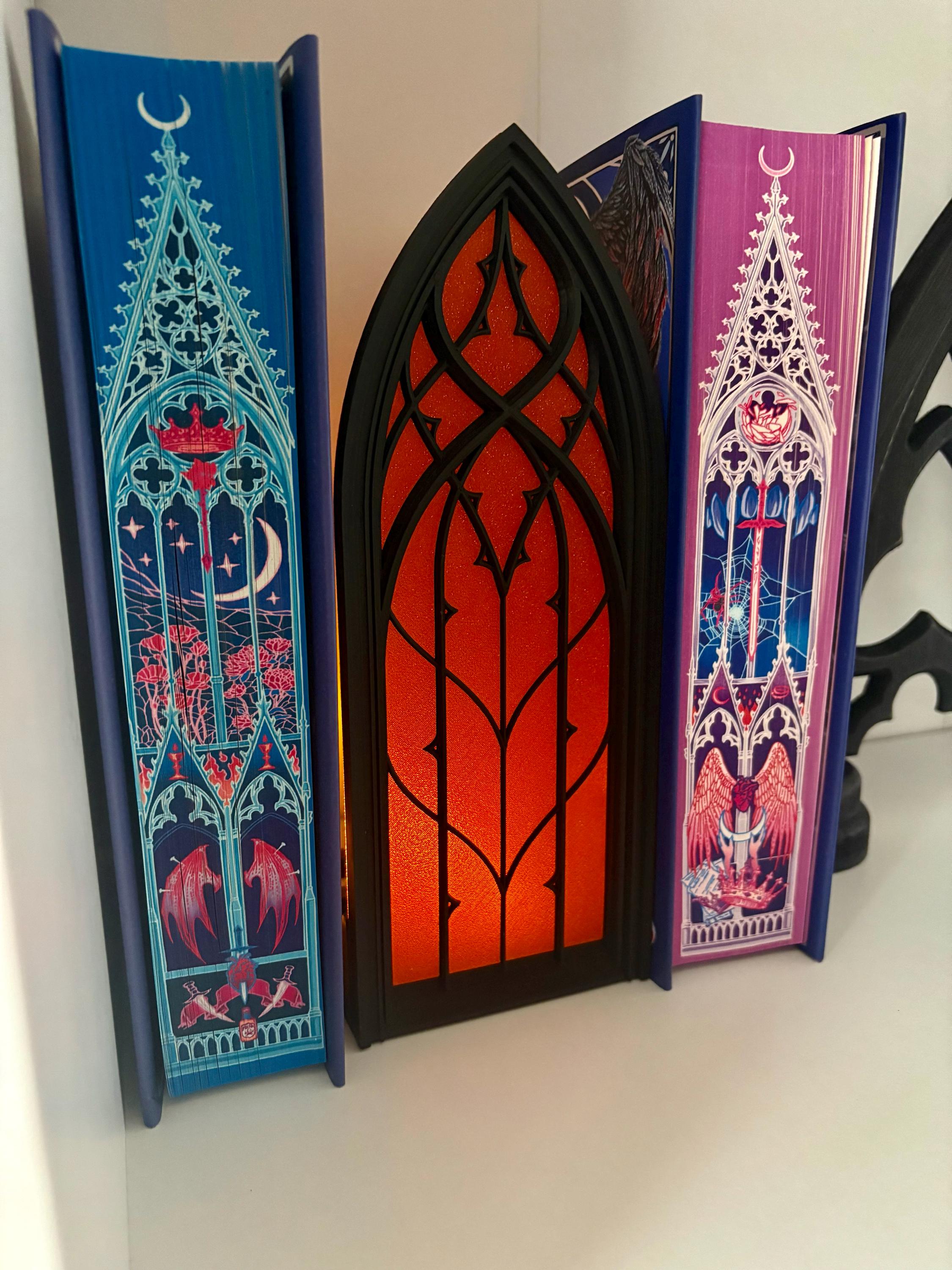 This is a book nook I designed inspired by gothic cathedrals and elven style architecture from Lord of the Rings. At night the LED candle shines through the transparent window creating a warm glow like an elven sanctuary right inside your bookcase. Perfect for fans of fantasy, Harry Potter, Fourth Wing, or anyone who wants to add some intrigue to their book collection.