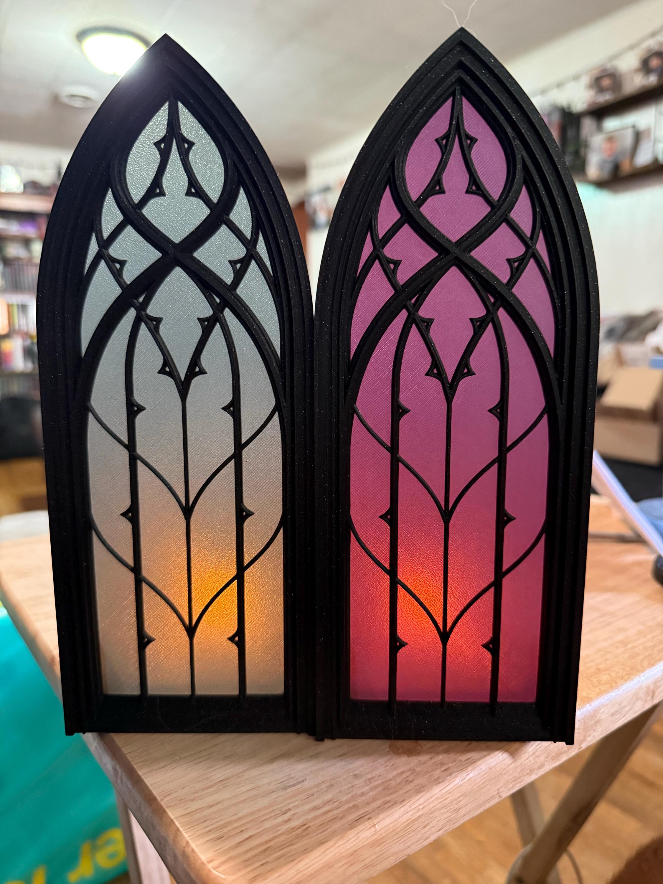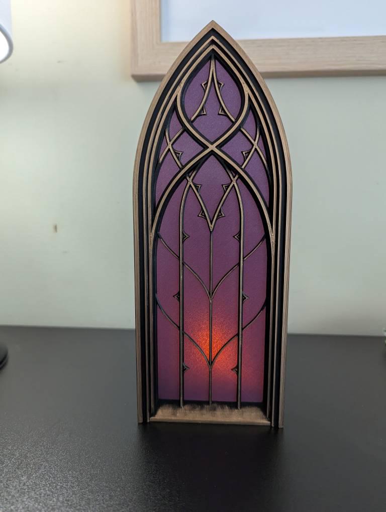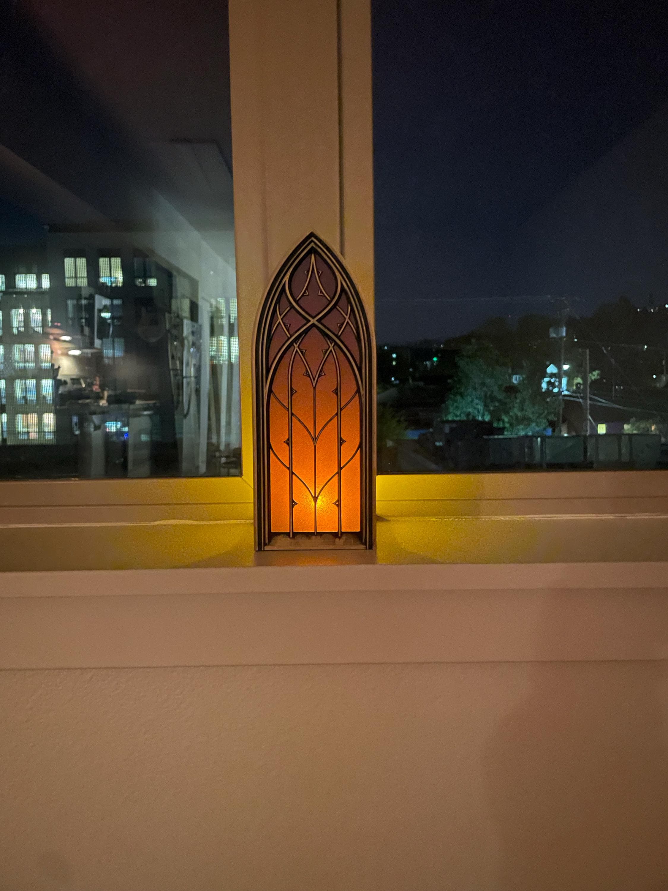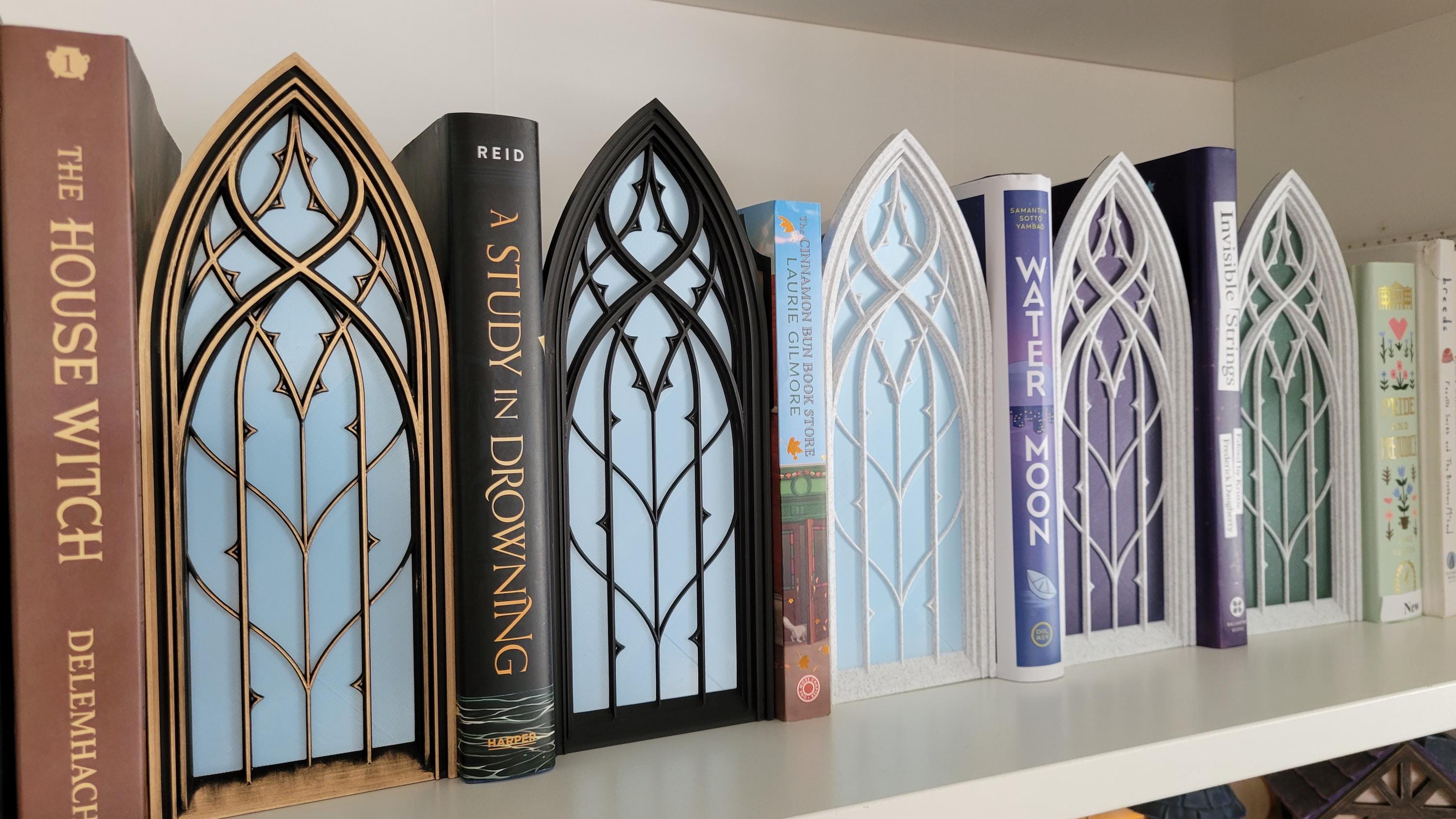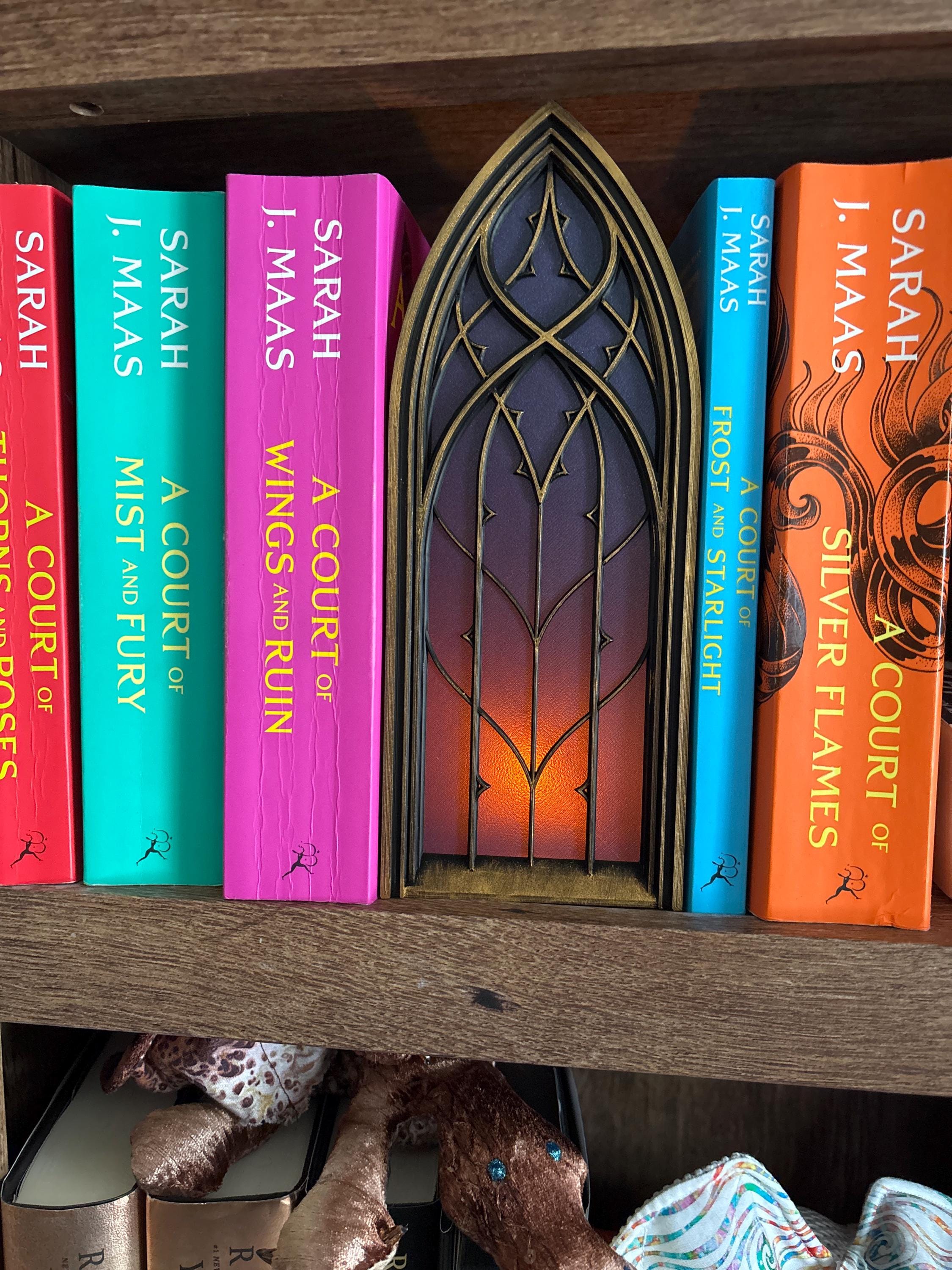 This is a book nook I designed inspired by gothic cathedrals and elven style architecture from Lord of the Rings. At night the LED candle shines through the transparent window creating a warm glow like an elven sanctuary right inside your bookcase. Perfect for fans of fantasy, Harry Potter, Fourth Wing, or anyone who wants to add some intrigue to their book collection.