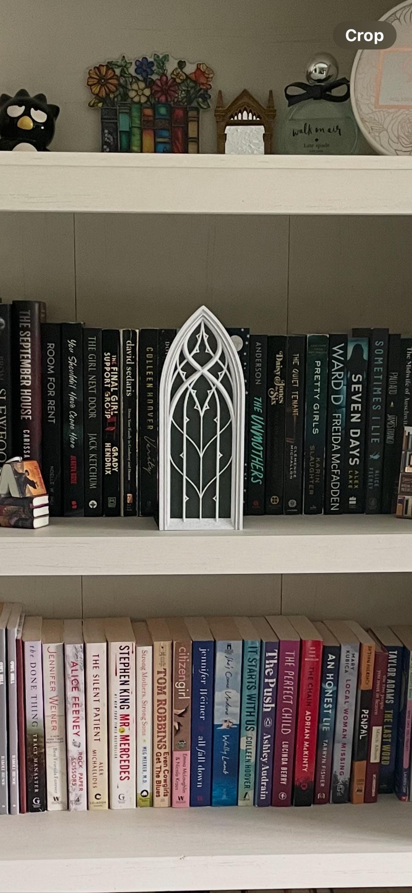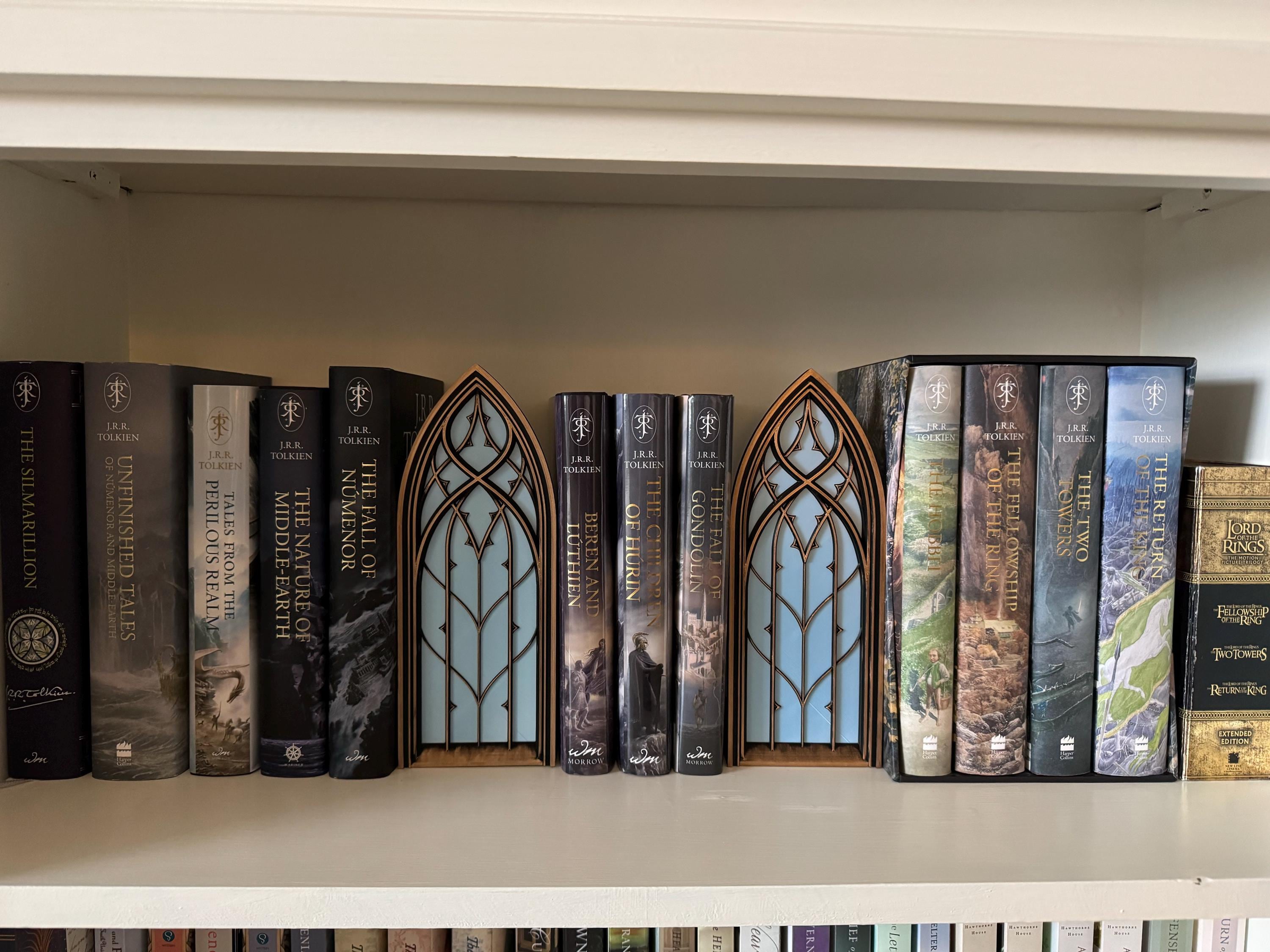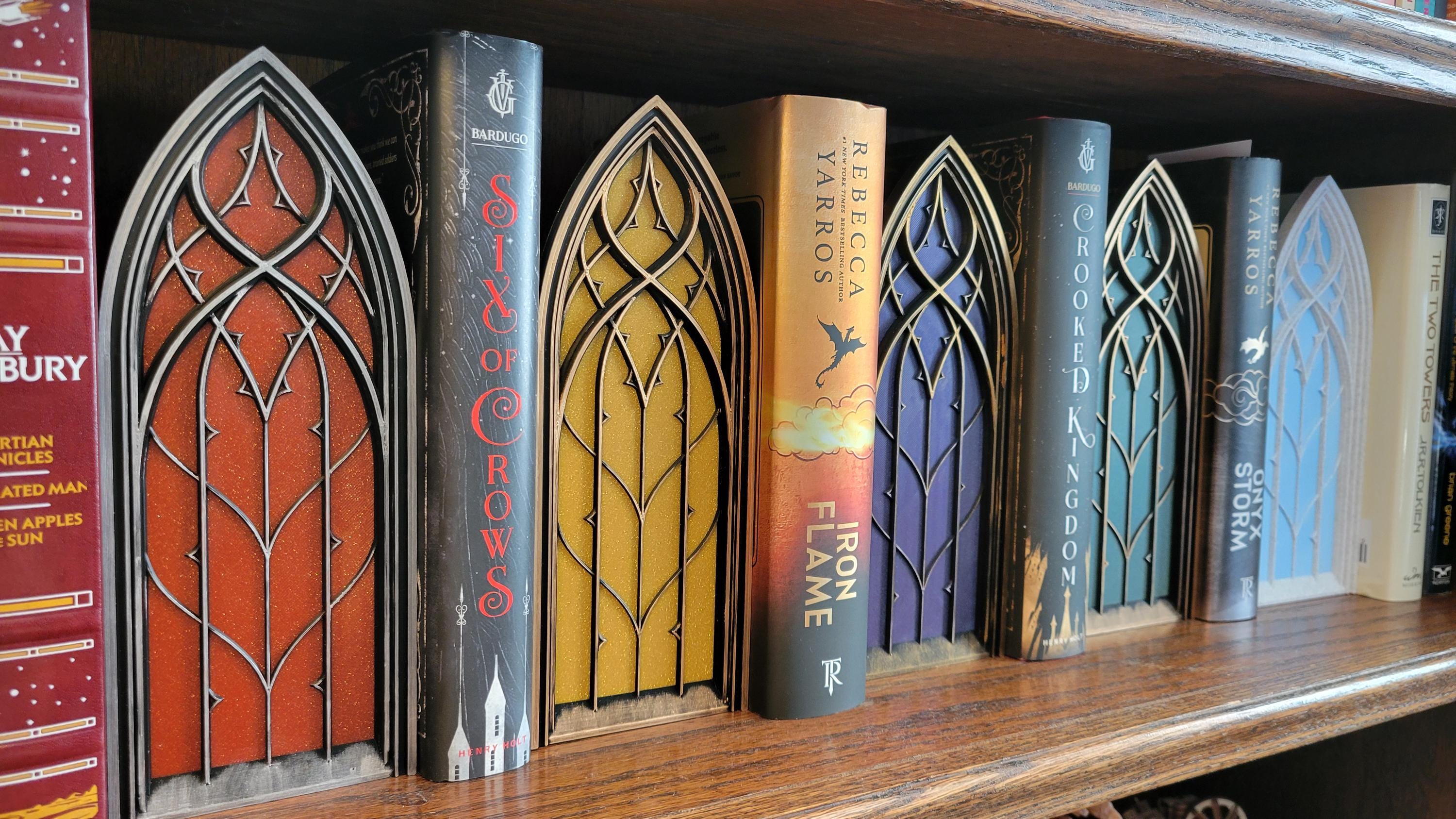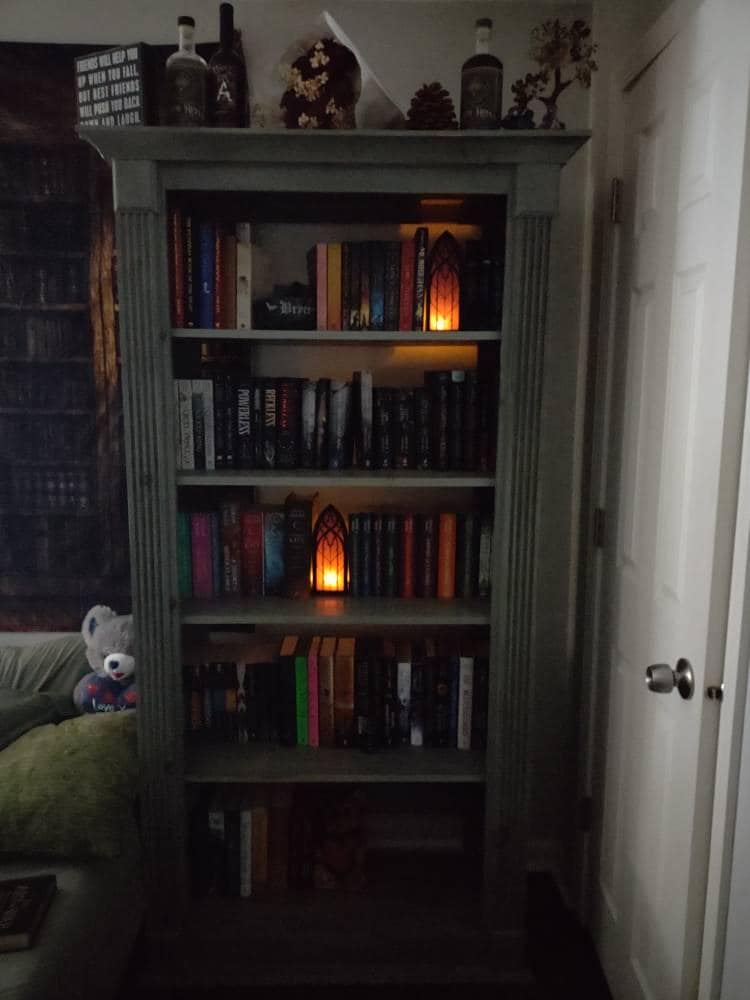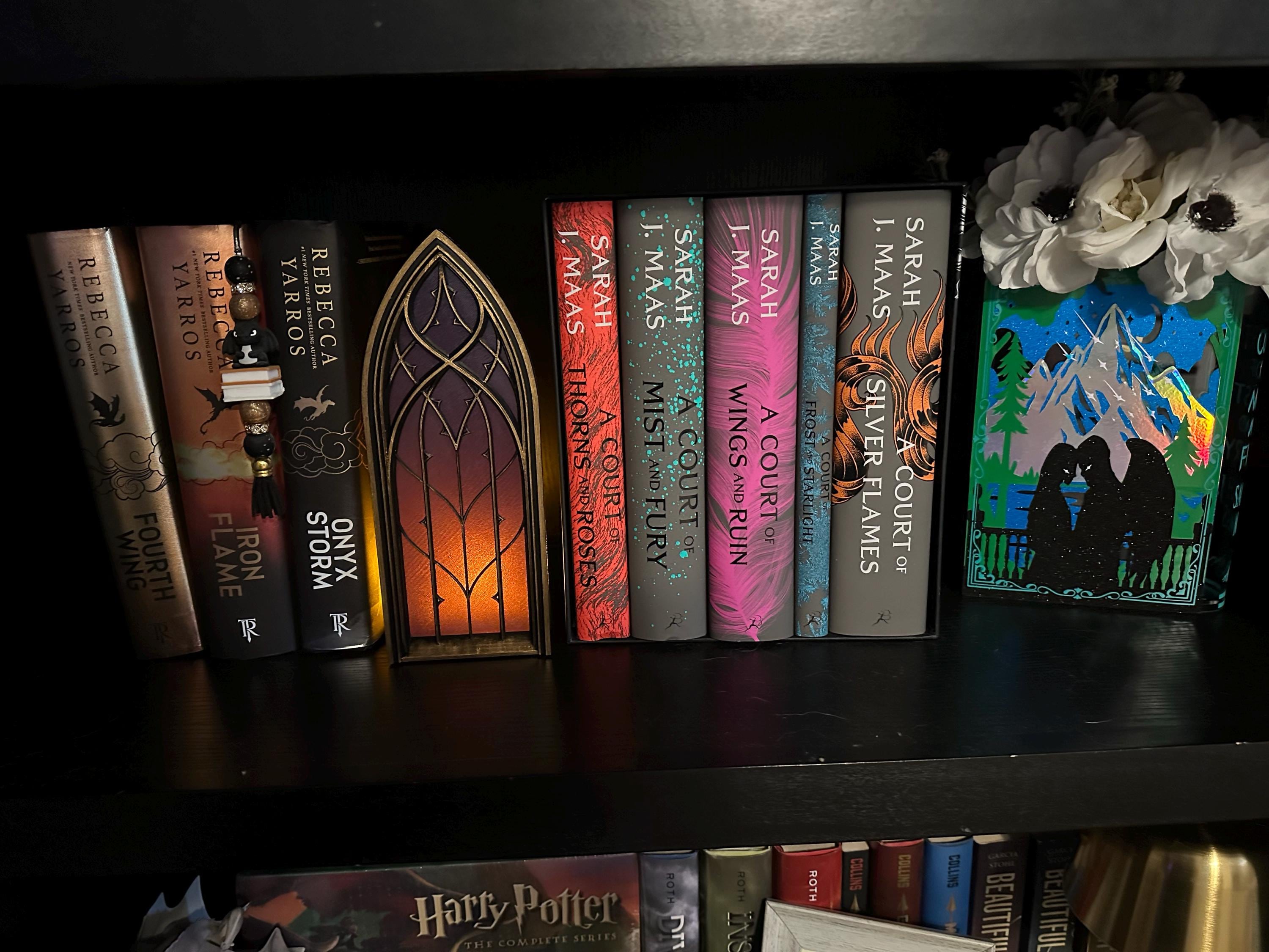 This is a book nook I designed inspired by gothic cathedrals and elven style architecture from Lord of the Rings. At night the LED candle shines through the transparent window creating a warm glow like an elven sanctuary right inside your bookcase. Perfect for fans of fantasy, Harry Potter, Fourth Wing, or anyone who wants to add some intrigue to their book collection.