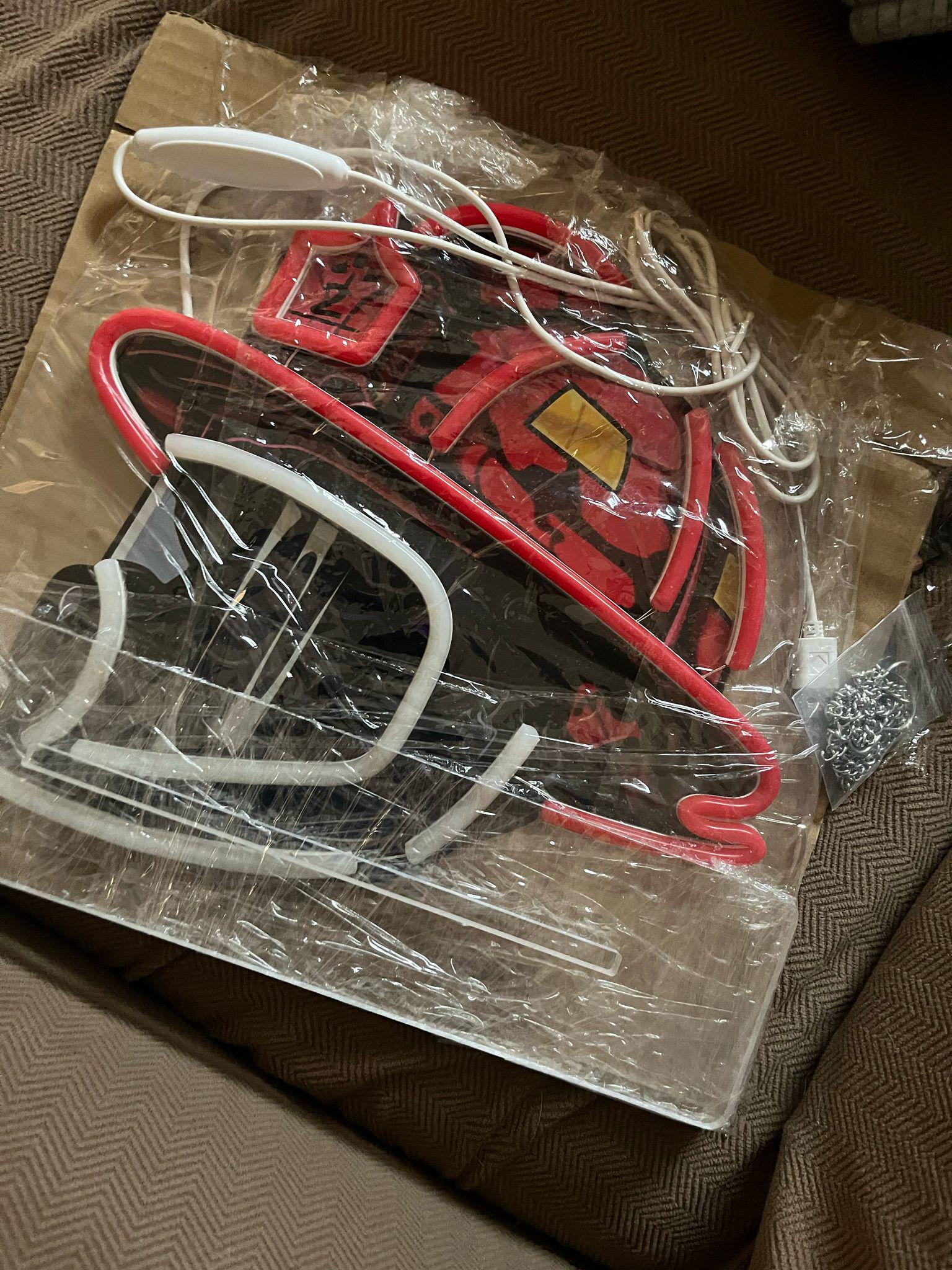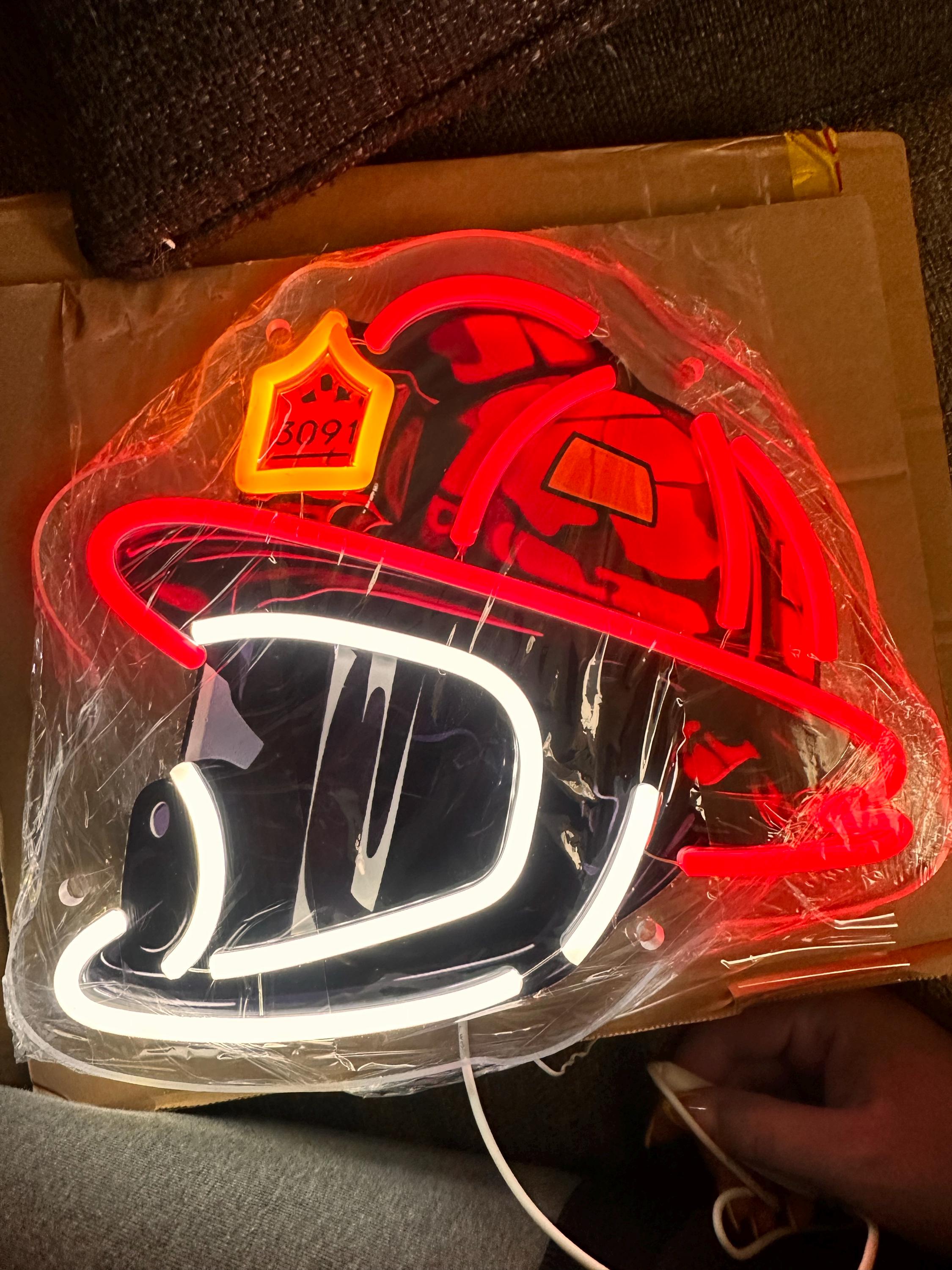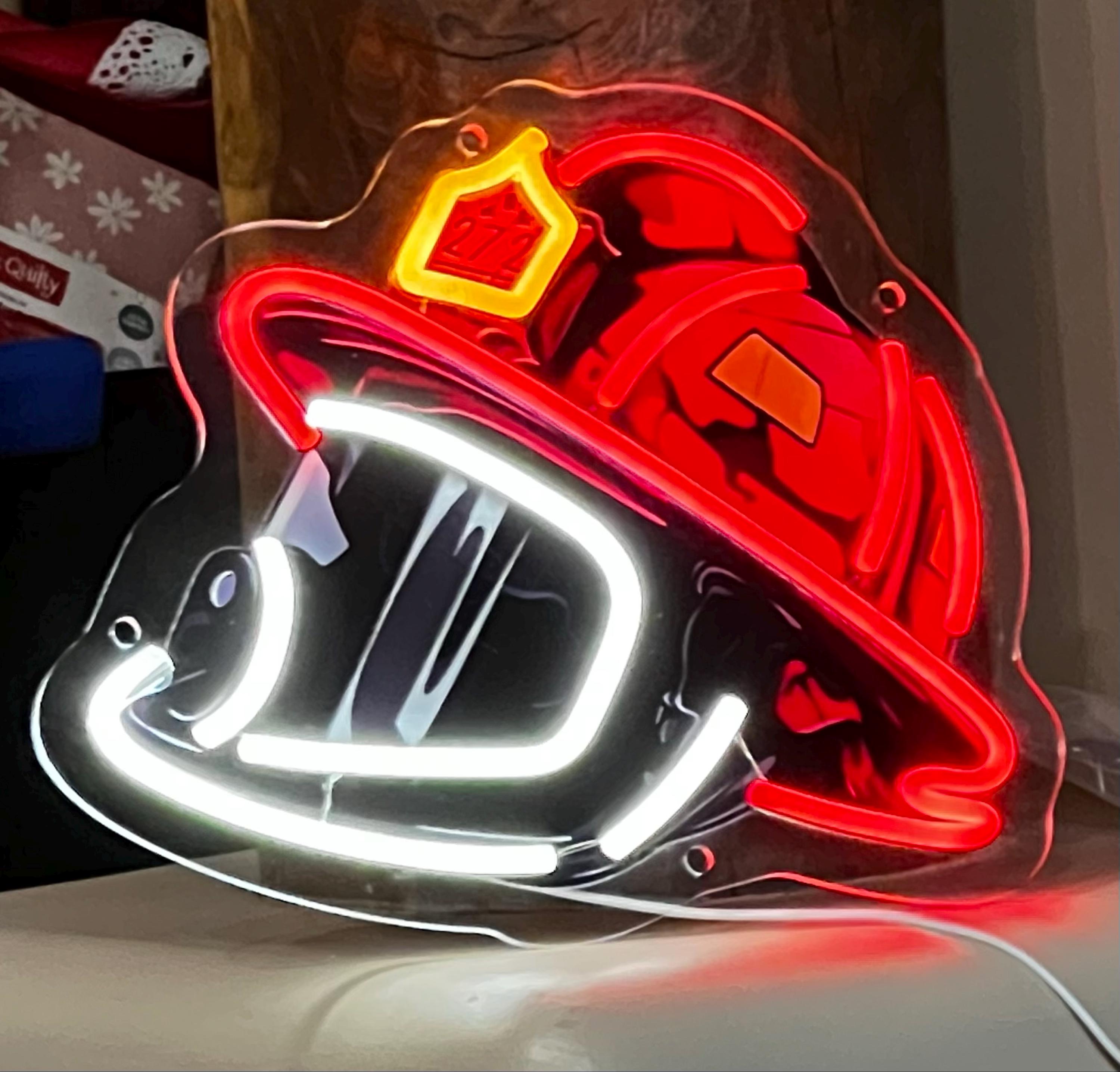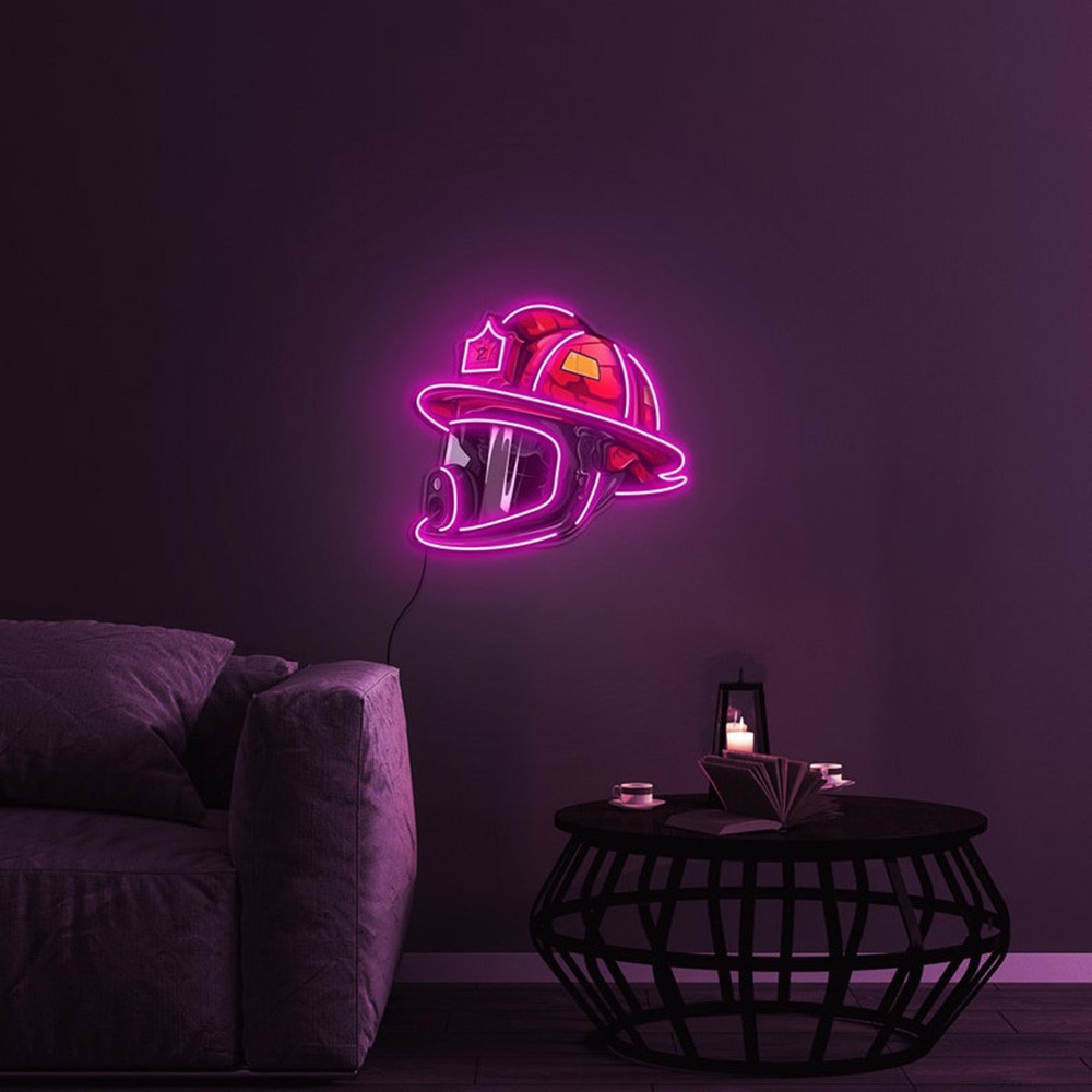 Our Firefighter Helmet Neon Sign! This custom LED neon sign adds a unique touch to home decor and makes a thoughtful gift for firefighters or fire station decorations.