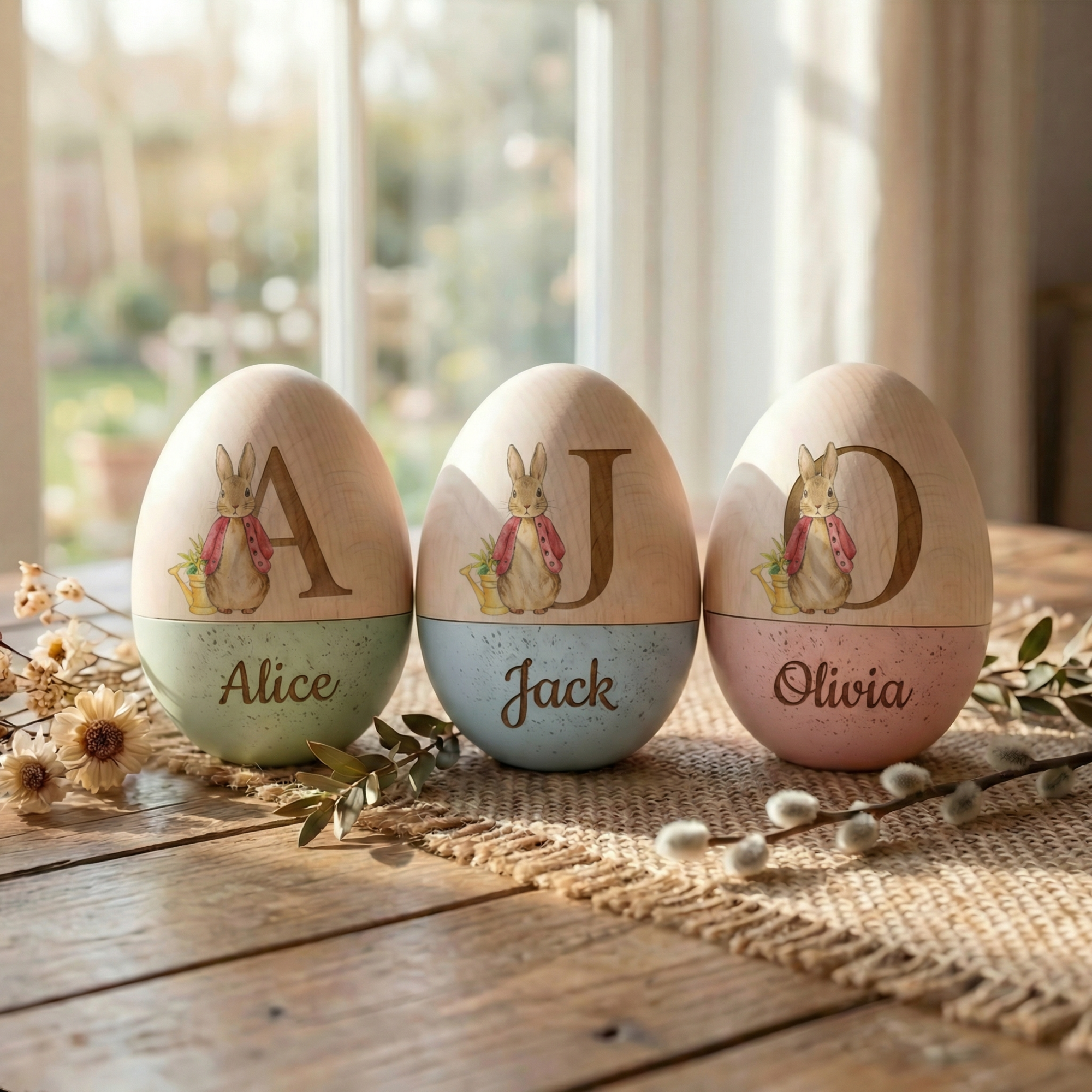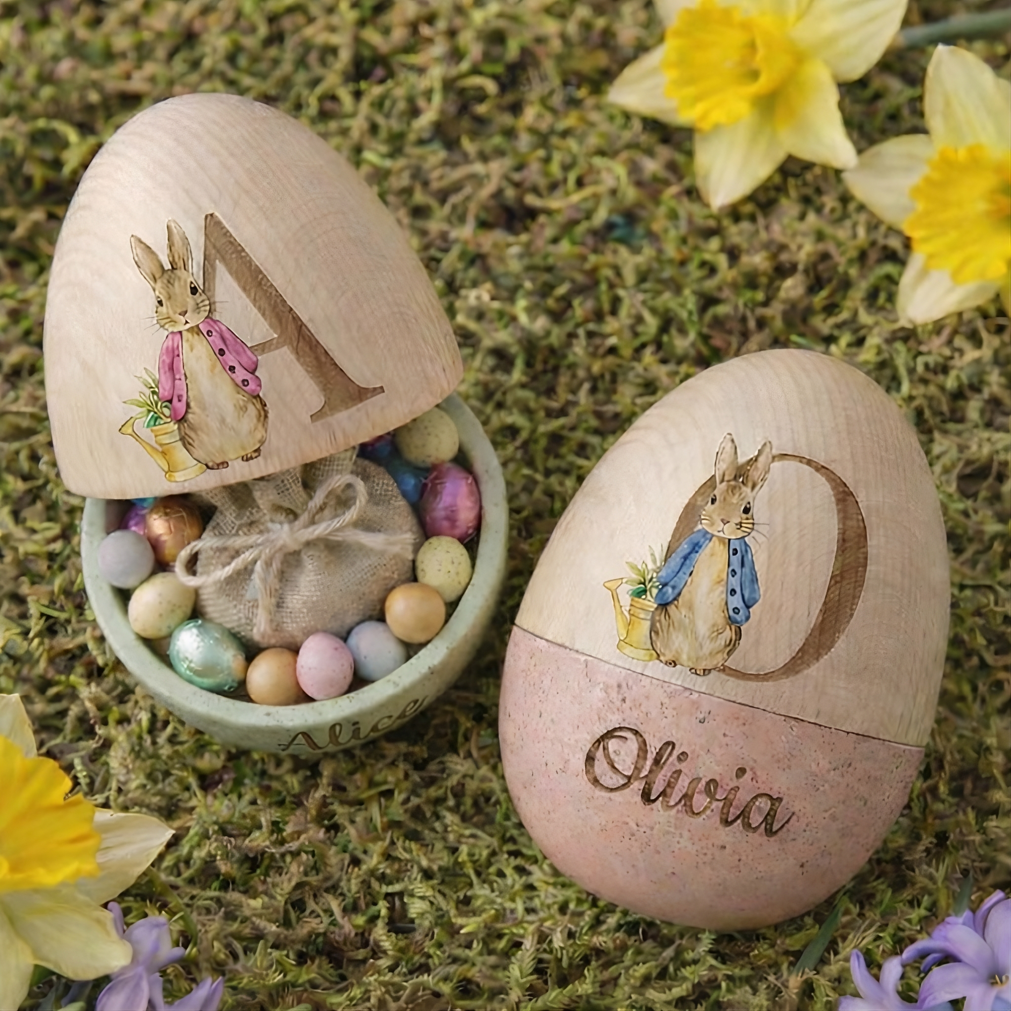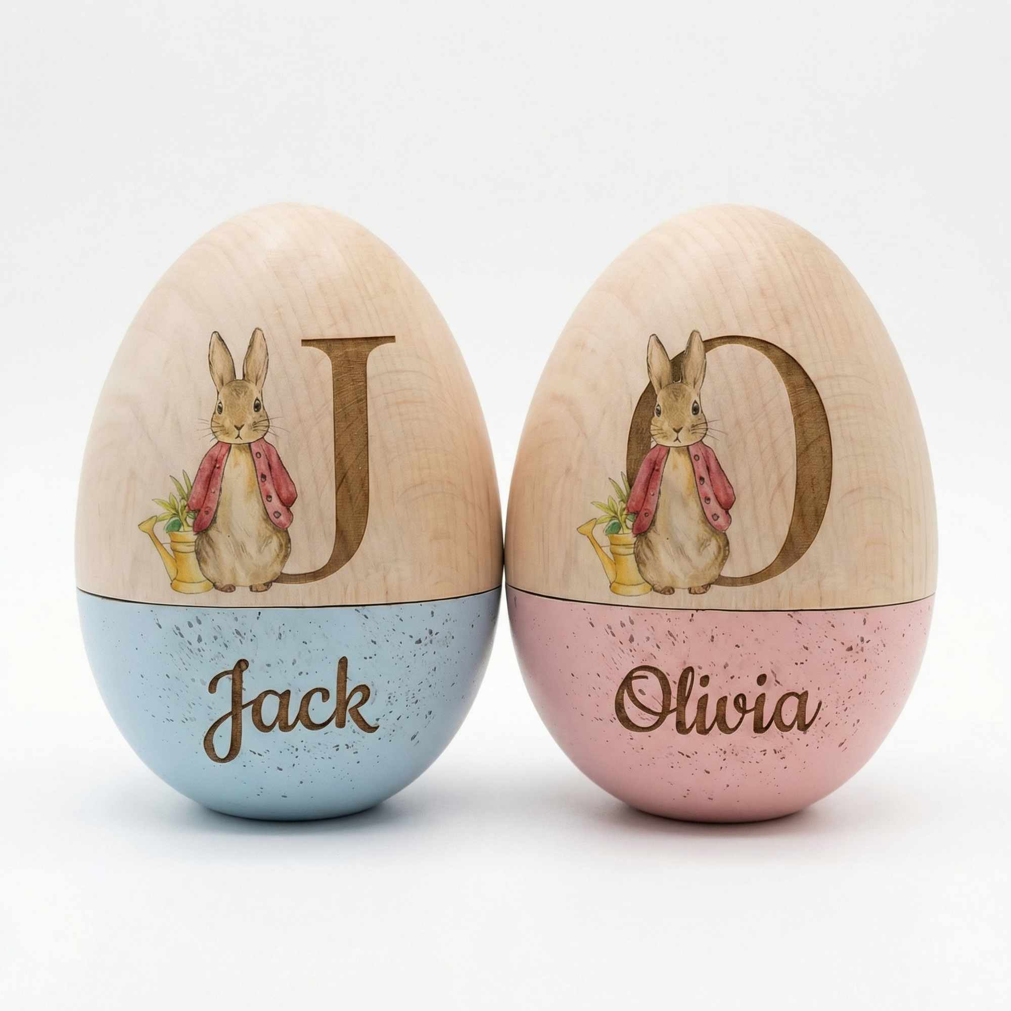 This wooden Easter egg features a delightful illustration of a classic bunny in a red jacket, paired with a large initial (like “O”) and a custom name (such as “Olivia”) engraved on the base. The rustic, natural wood finish adds a cozy, timeless touch to any Easter decor.