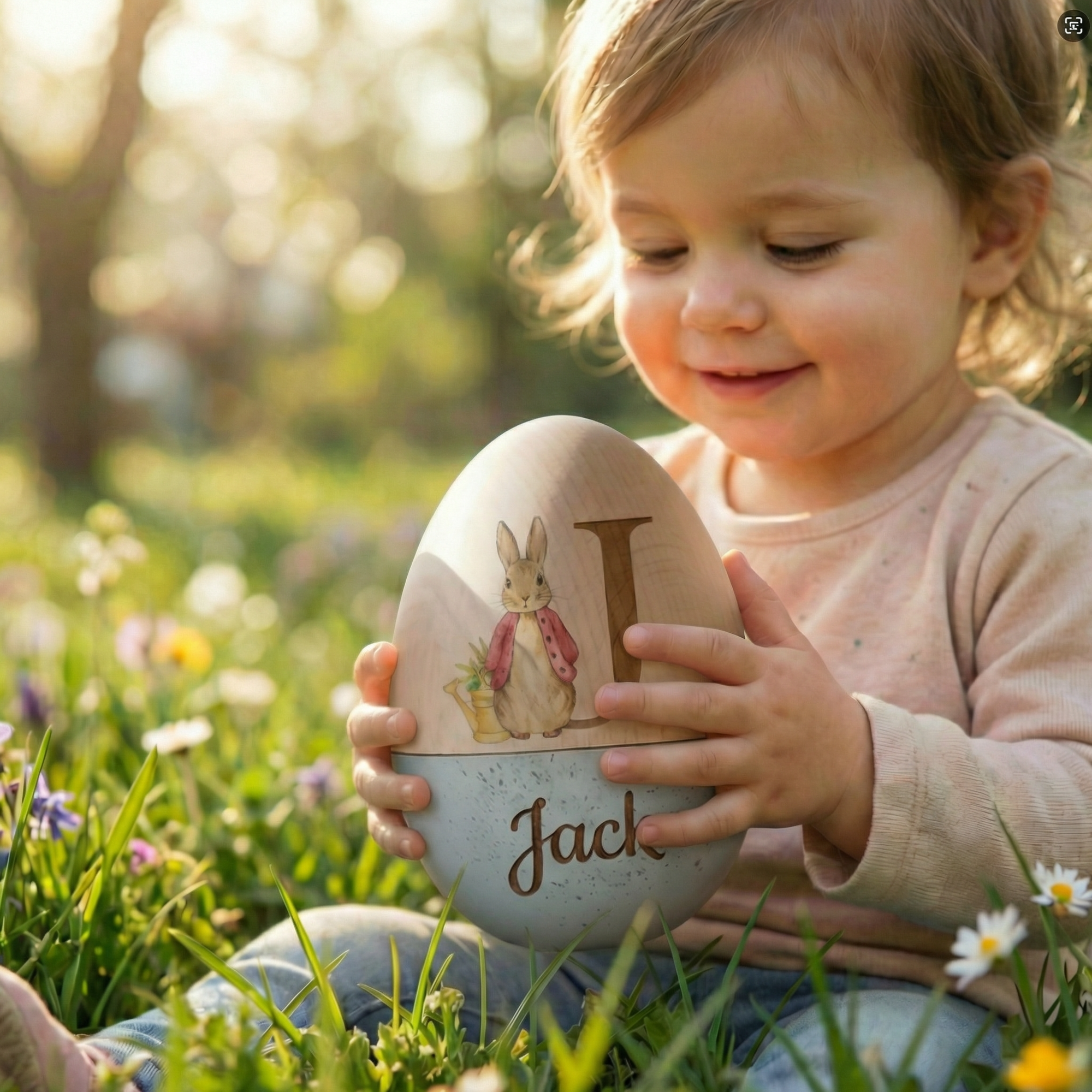 Customize the egg with your child’s name and initial, turning a simple keepsake into a one-of-a-kind treasure. The engraved text blends seamlessly with the bunny design, making it a special memento of their Easter celebrations.