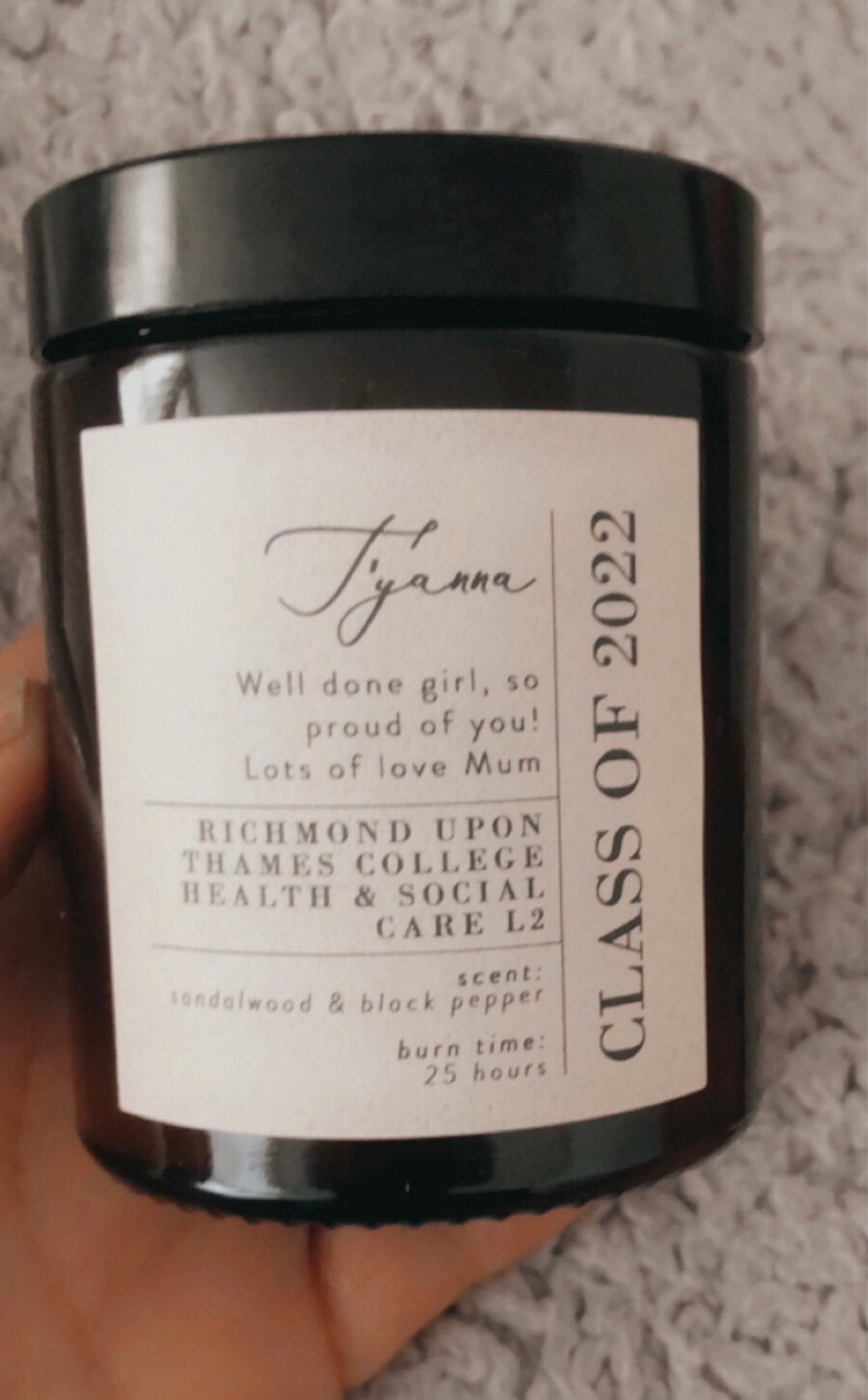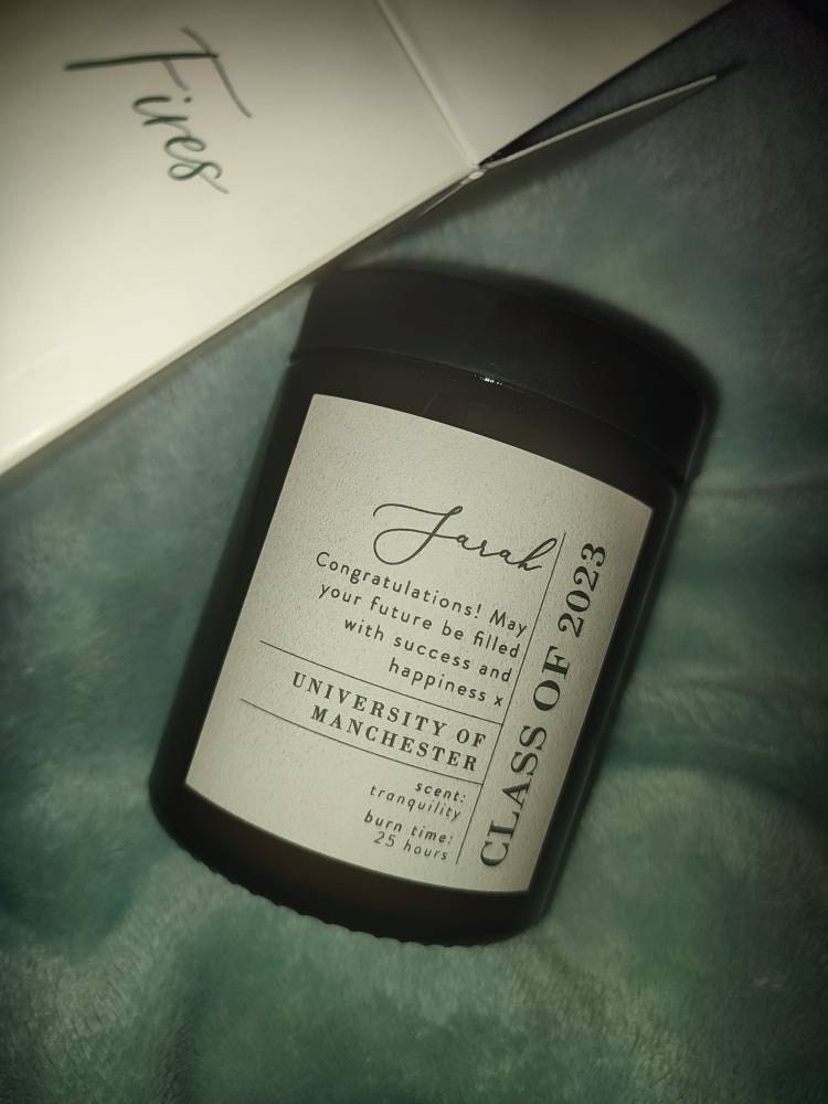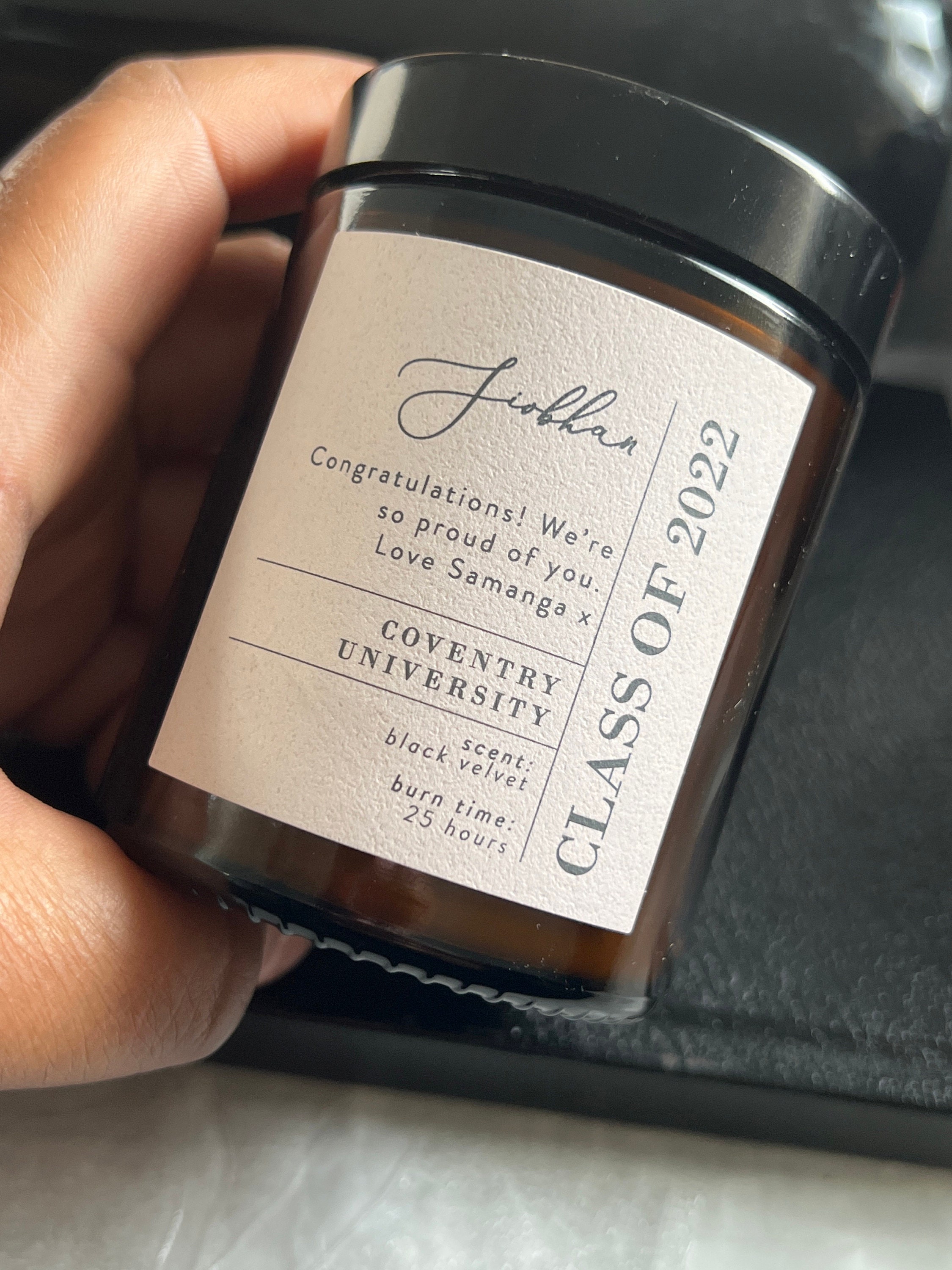 The soft cream label features the recipient's name in a beautiful charcoal cursive font above your personalised message of congratulations. Divided by simple lines, the student's university, the candle's scent and burn time are displayed below and the year of graduation is emphasised to the right. This lovely graduation gift for her is a thoughtful memento and a great way to mark the start of an exciting new chapter!