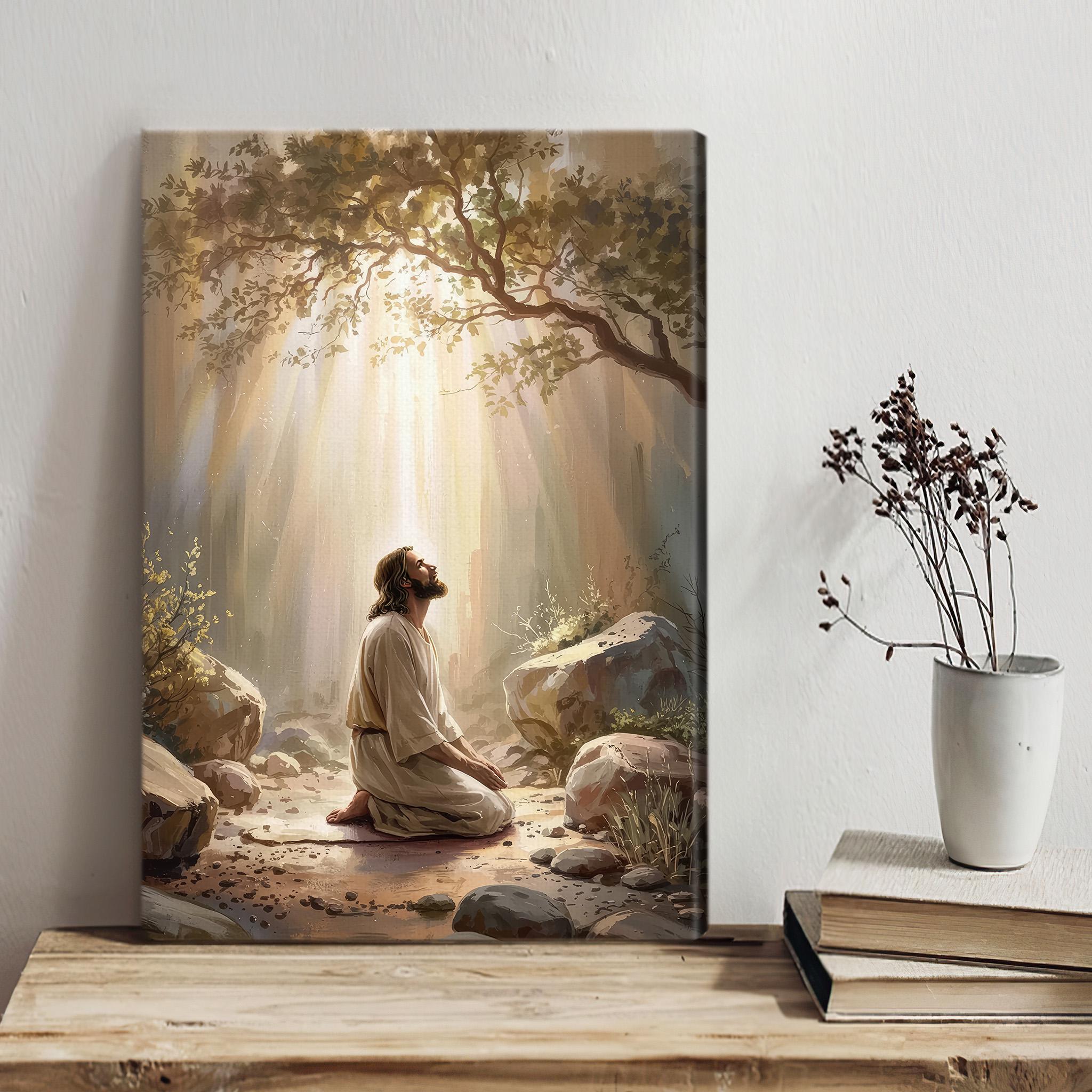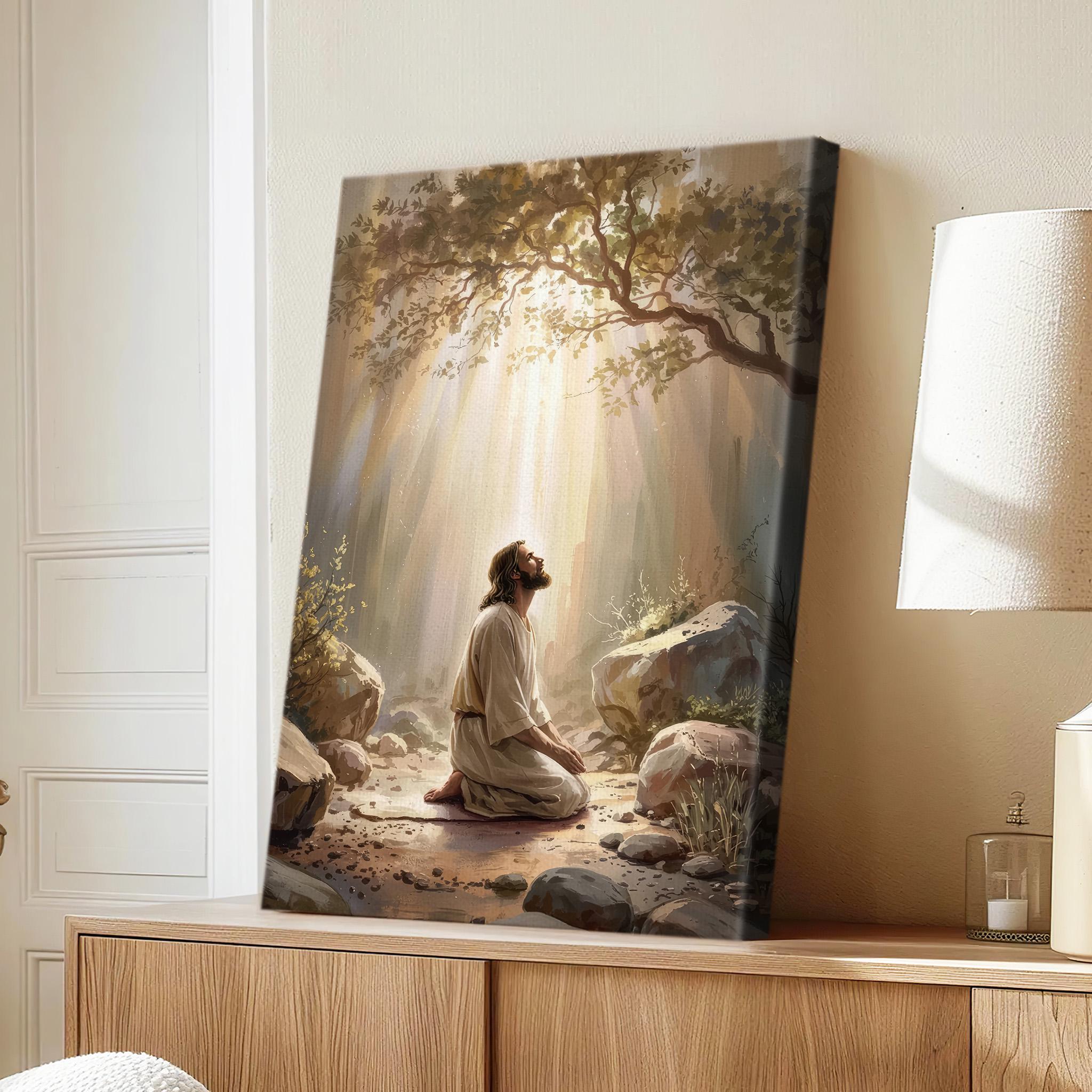 Jesus Praying in Garden of Gethsemane Canvas Wall Art, Christian Prayer Artwork for Home Decor, Spiritual Religious Gift for Believers, High Quality Faith-Based Print on Stretched Wood Frame — this inspirational piece captures a serene and powerful moment of Jesus in deep prayer, bathed in heavenly light in the Garden of Gethsemane.