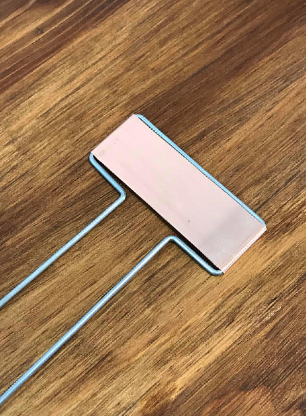 The tag is made of copper and the wire frame is made of galvanized steel. The product measures 10" tall and 2.5" wide. The actual copper part is 1” tall and 2.5” wide. The legs measure 9” tall.