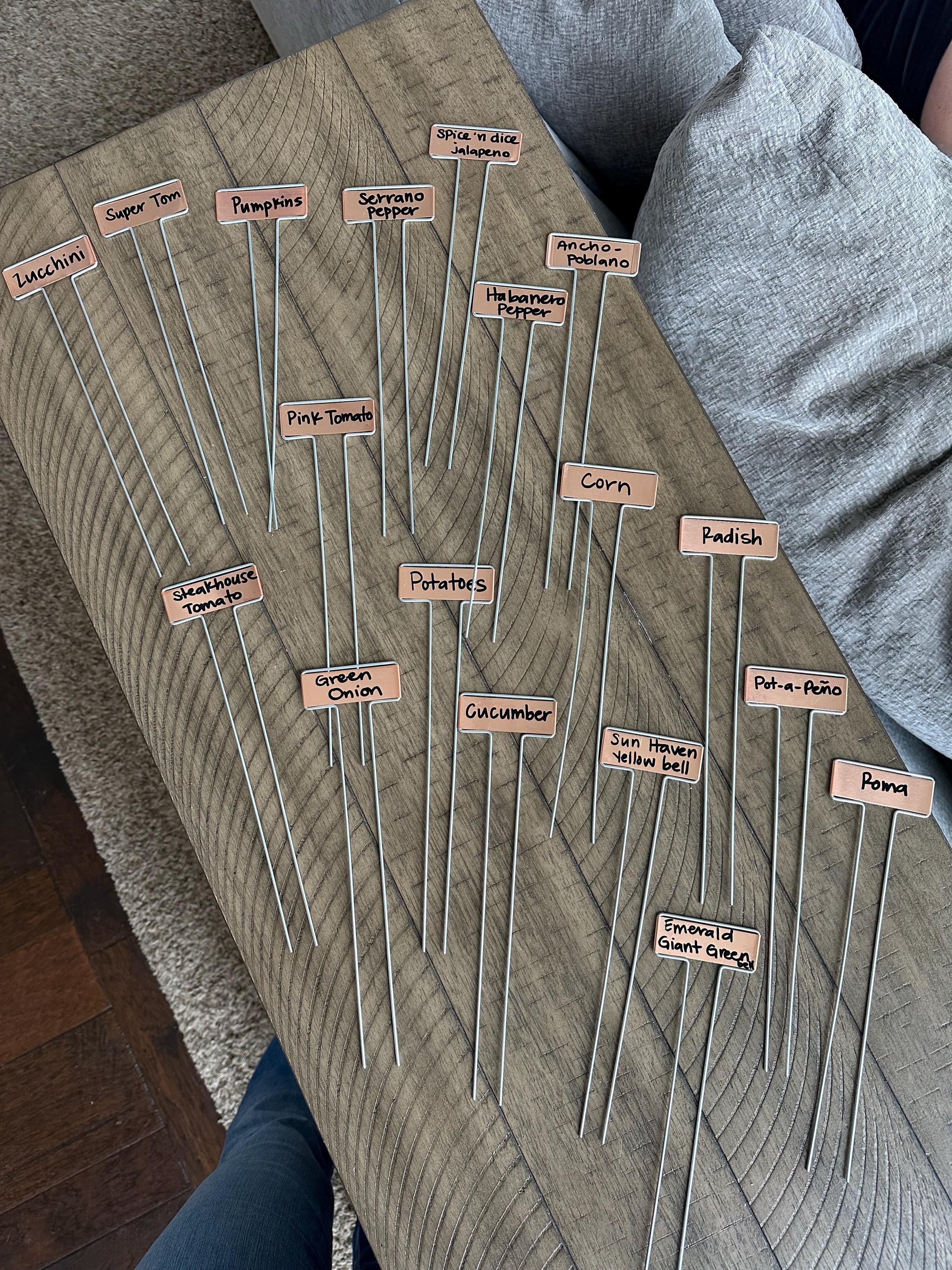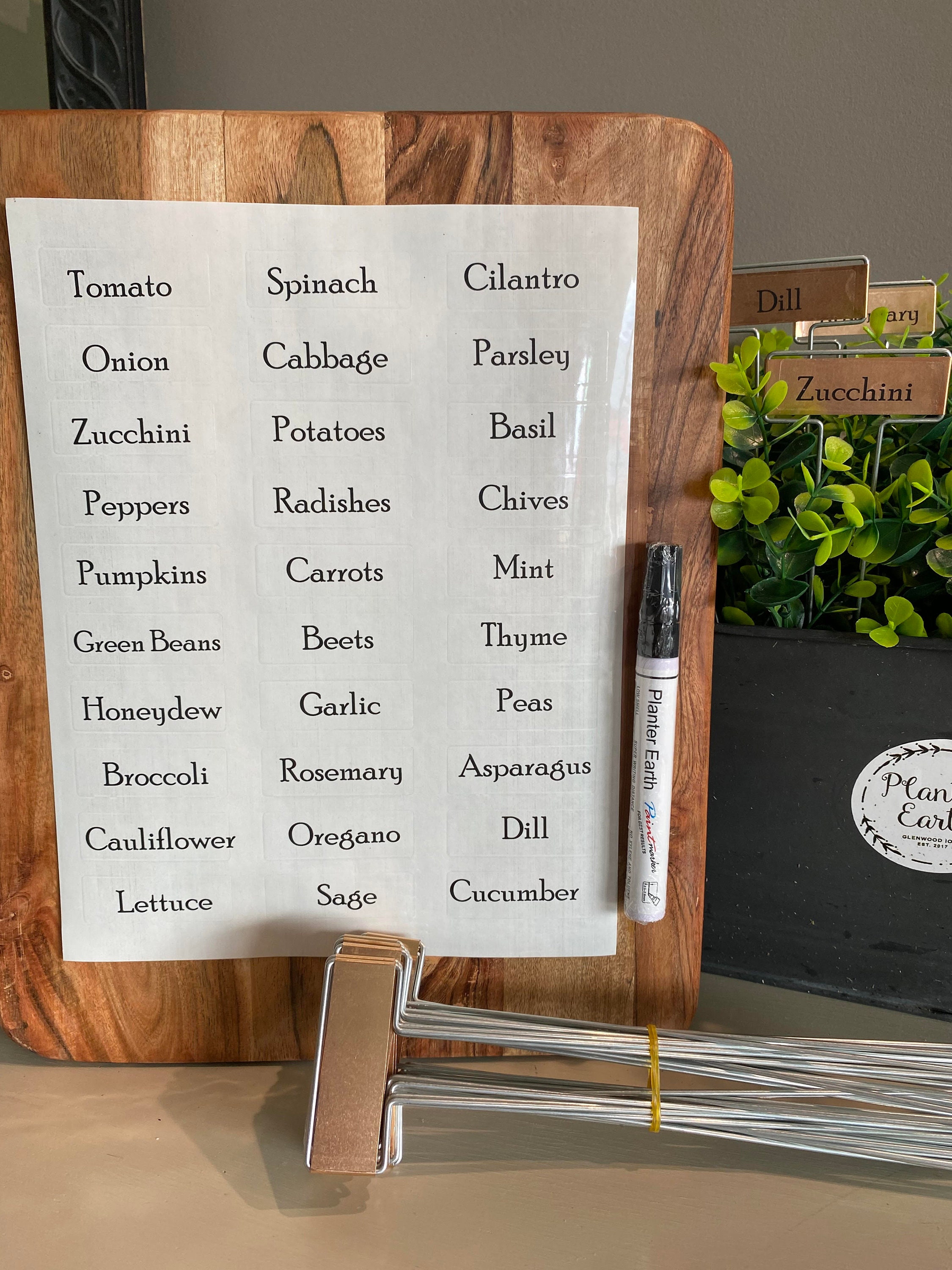 List of labels included in our standard order. 20 packs get 1 of each, 40 packs get 2 of each, 80 packs get 4 of each: Tomato, Onion, Zucchini, Peppers, Pumpkins, Green Beans, Honeydew, Broccoli, Cauliflower, Lettuce, Spinach, Cabbage, Potatoes, Radishes, Carrots, Beets, Garlic, Rosemary, Oregano, Sage, Cilantro, Parsley, Basil, Chives, Mint, Thyme, Peas, Asparagus, Dill, Cucumber.
