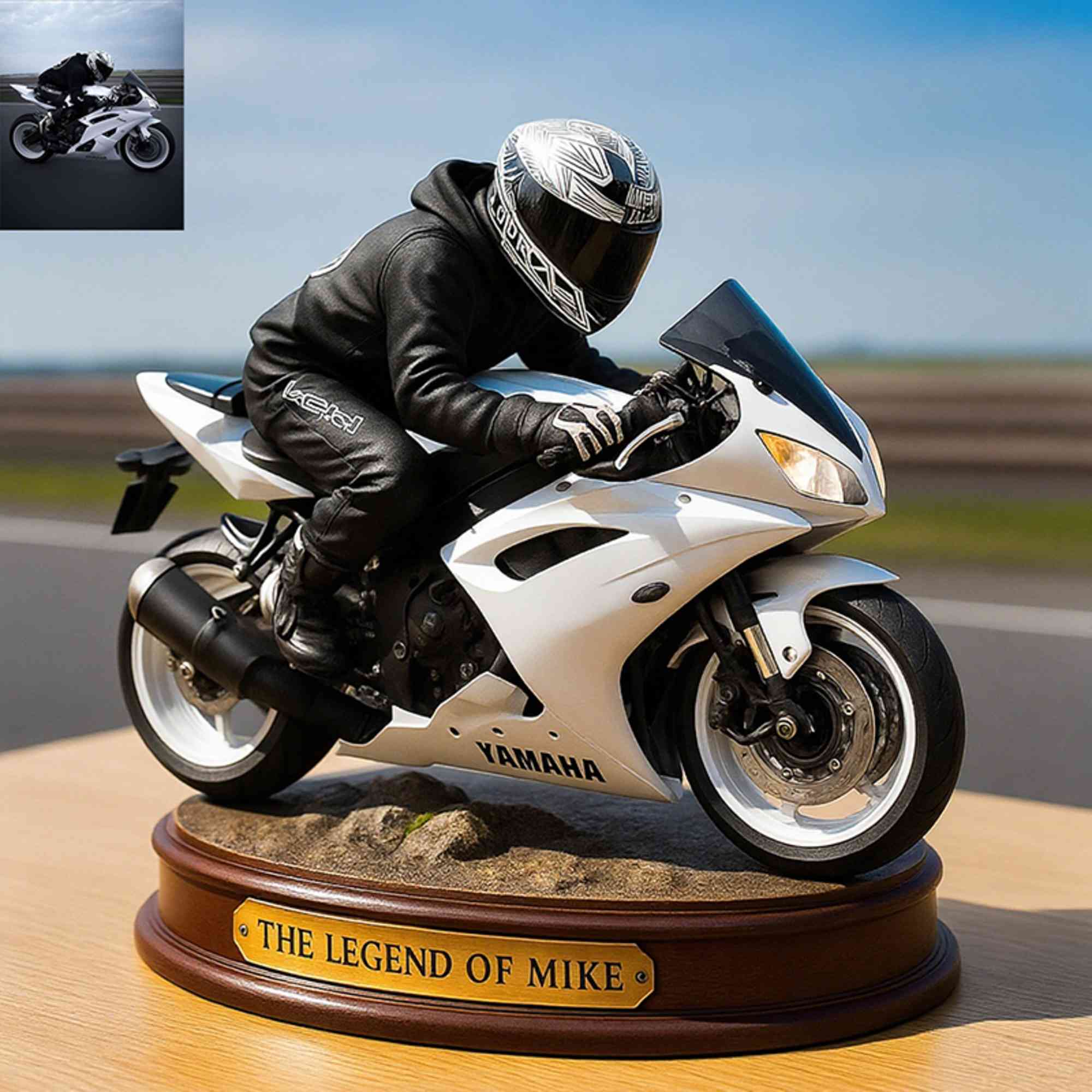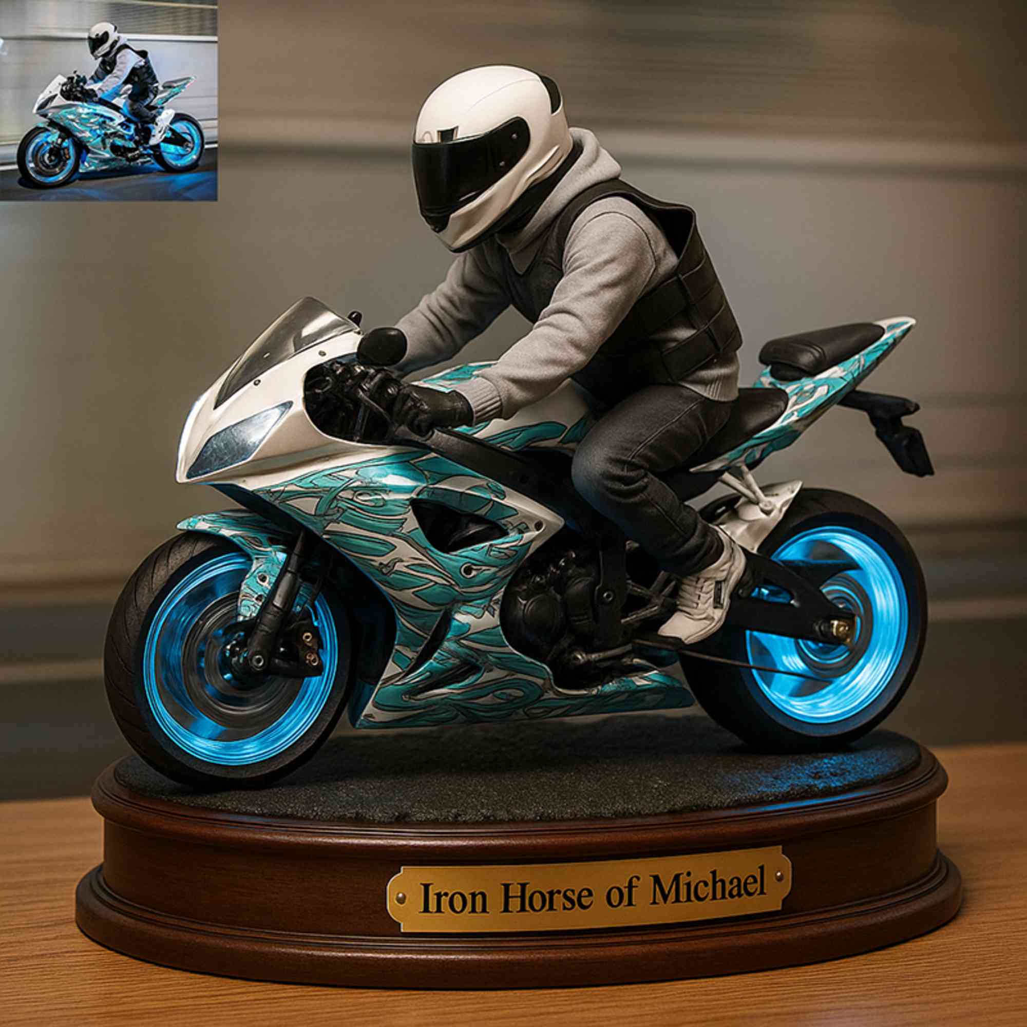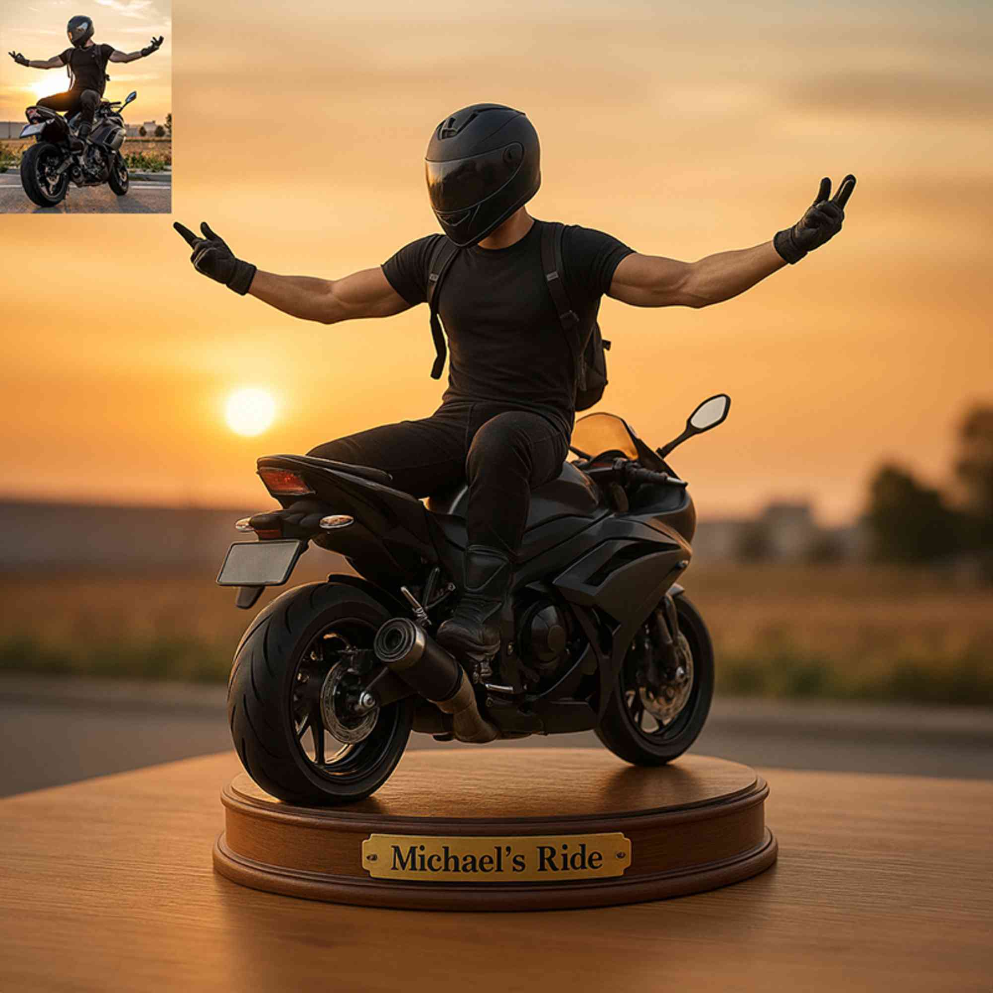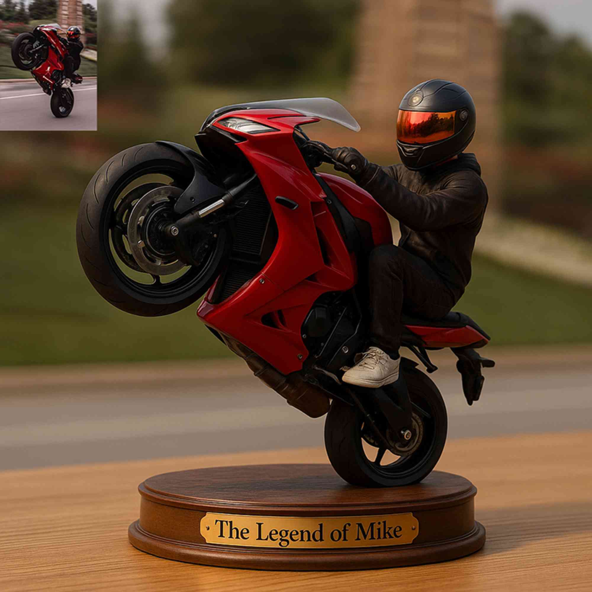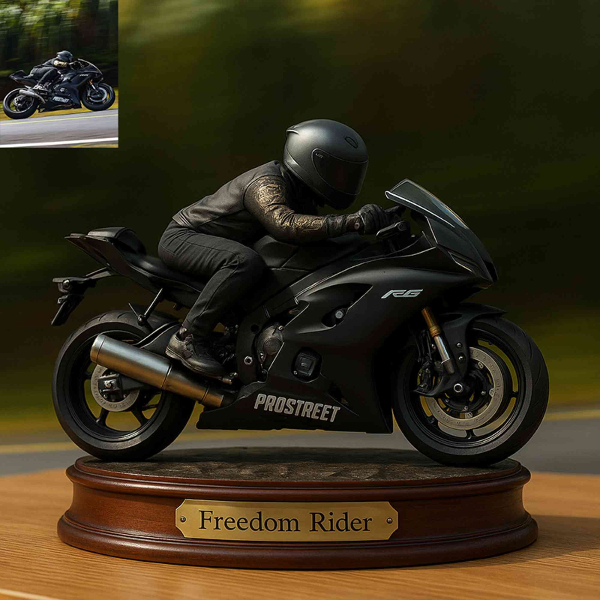 Upload your favorite motorcycle photo and add custom text to the base - whether it's your rider name, a special date, or meaningful quote. Each element comes together to create a truly unique tribute to your two-wheeled passion.