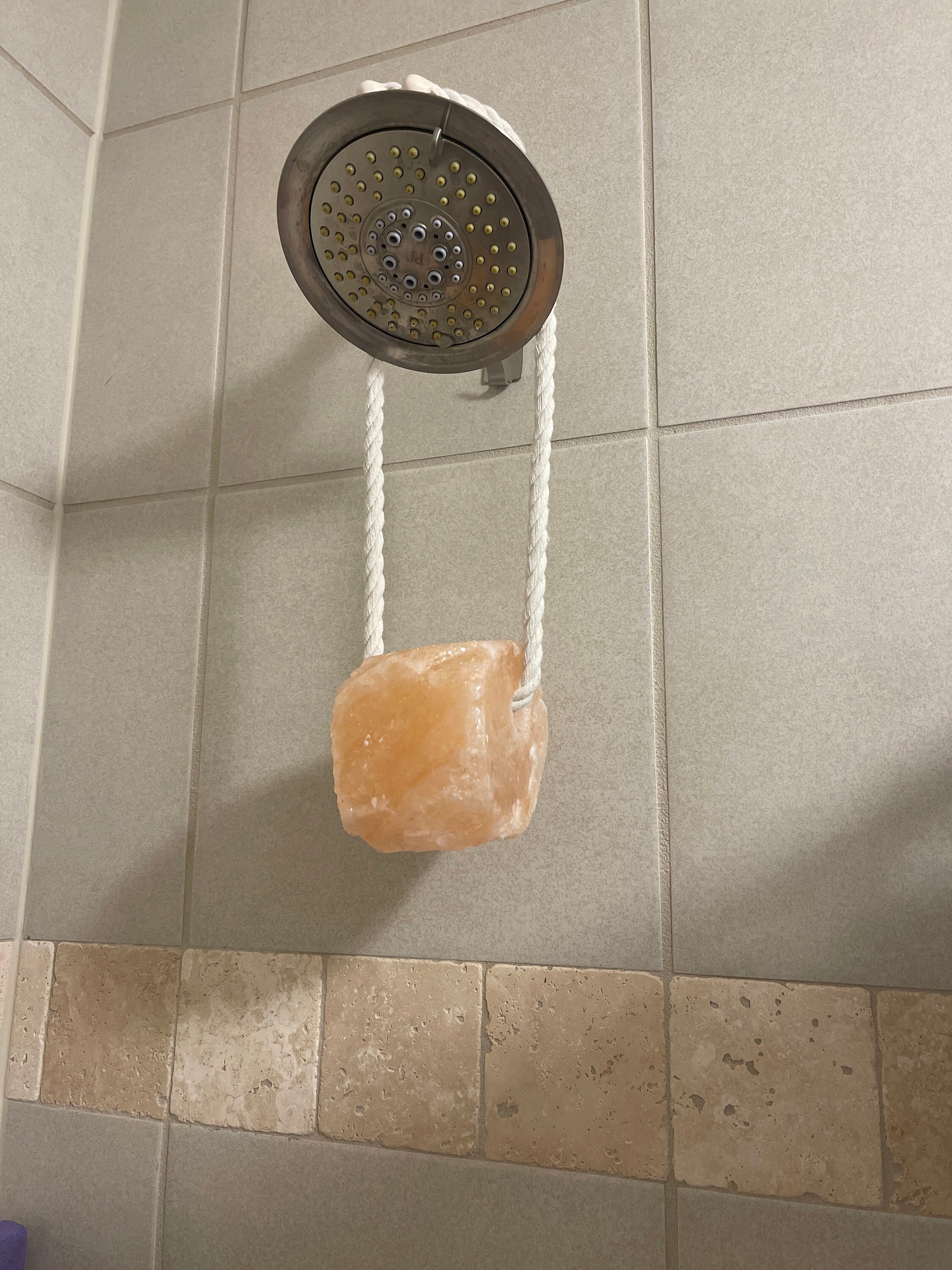Shower: Hang securely on the shower handle or the shower head. If you would like the water to hit the rock wrap the rope or tie the knot higher up. Take caution when hanging high to make sure it does not fall. Do not hang on rain shower heads. You can also place the rock on the ground or bench.