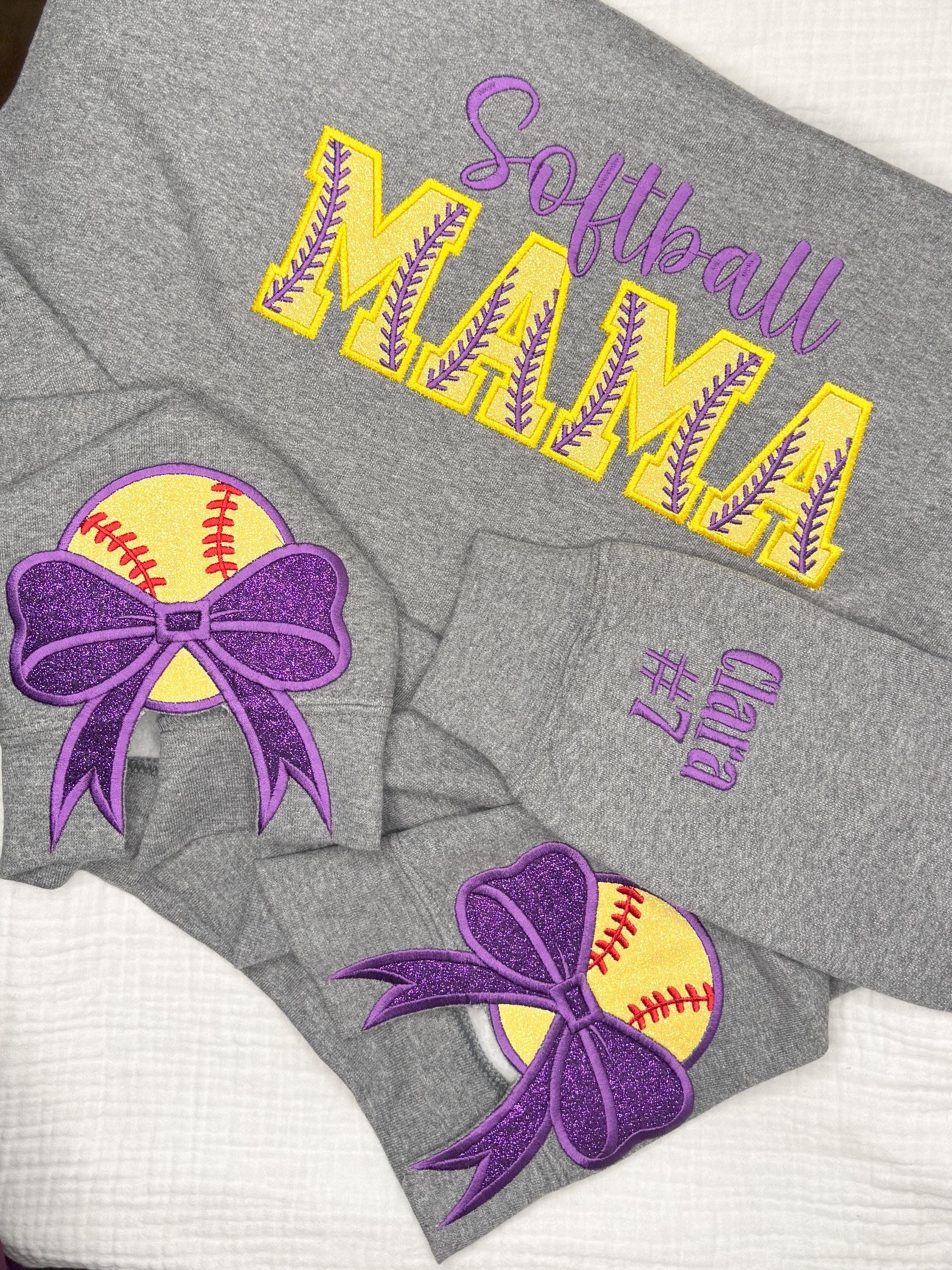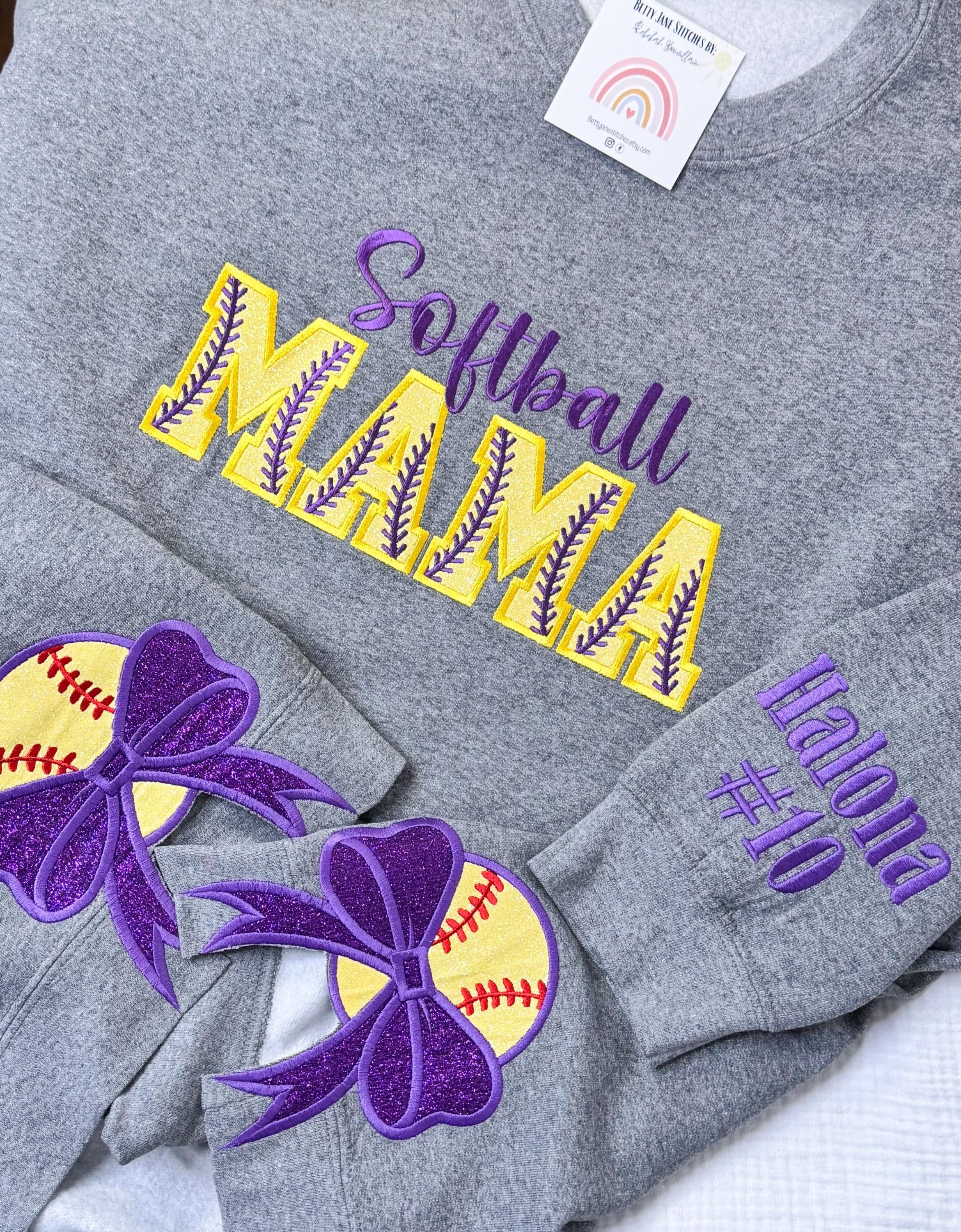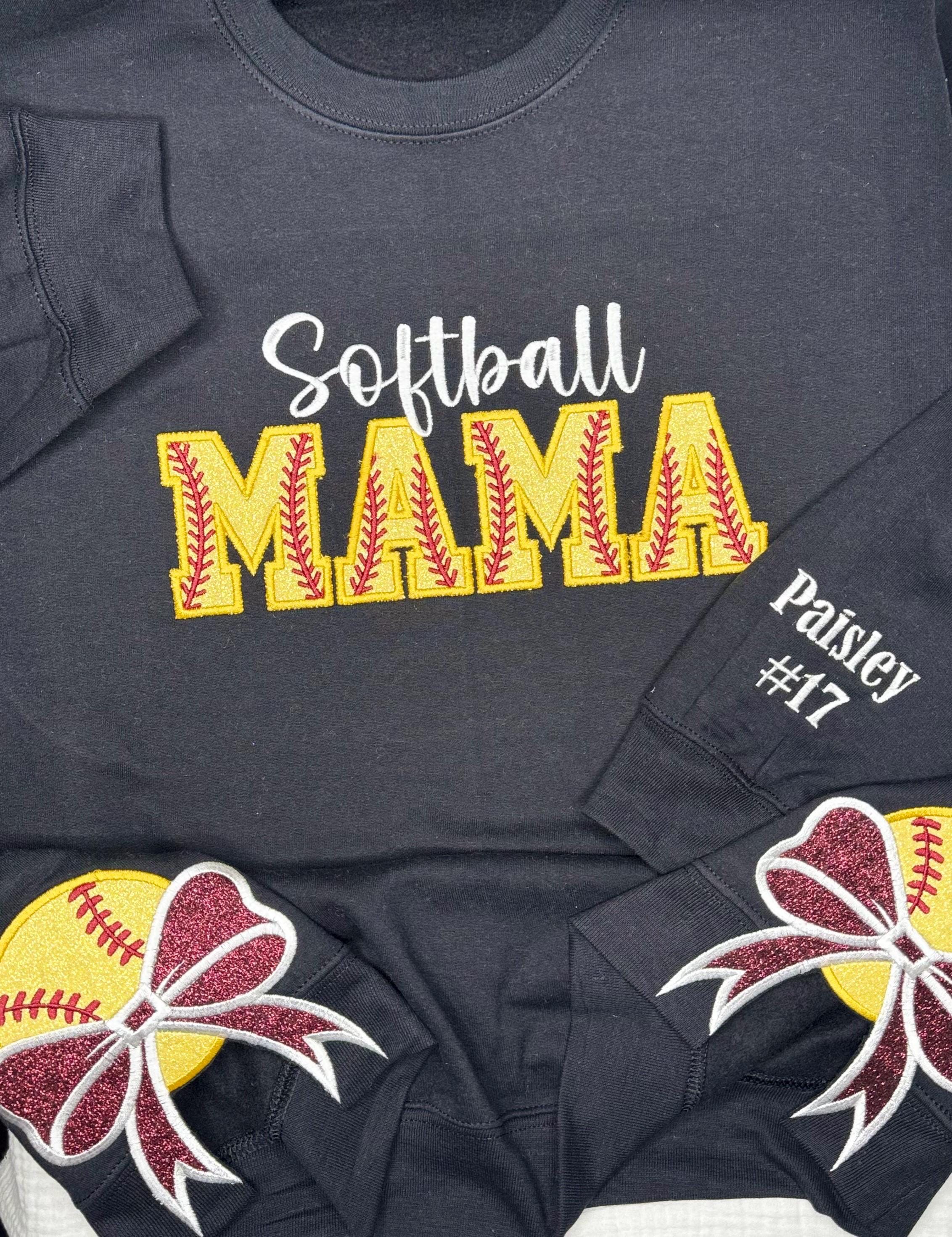 This listing is for crewneck sweatshirt with softball mama embroidered and appliquéd on the chest with softball side bow applique and the players name and number on the sleeve!