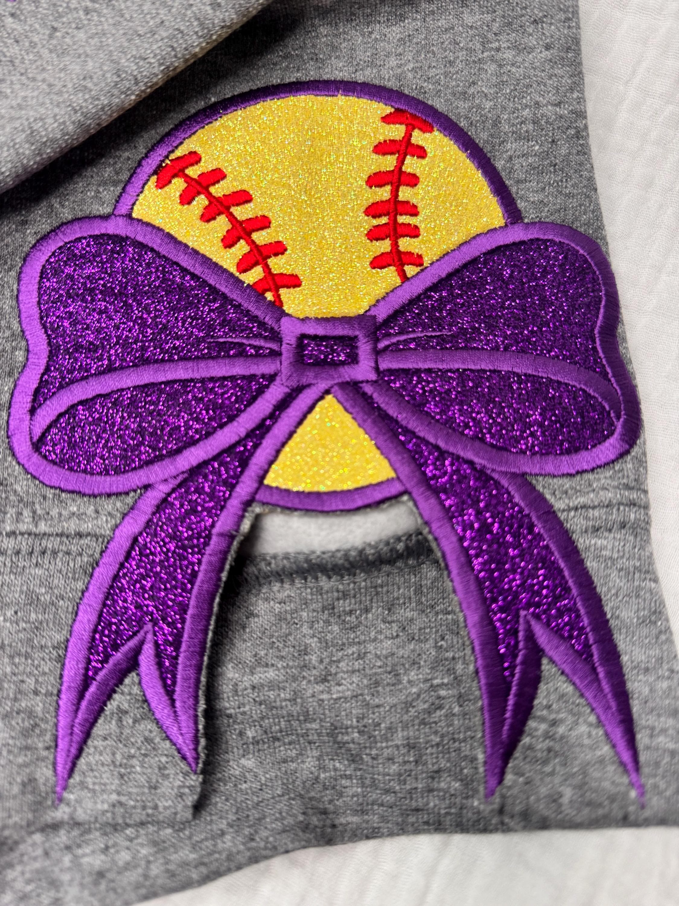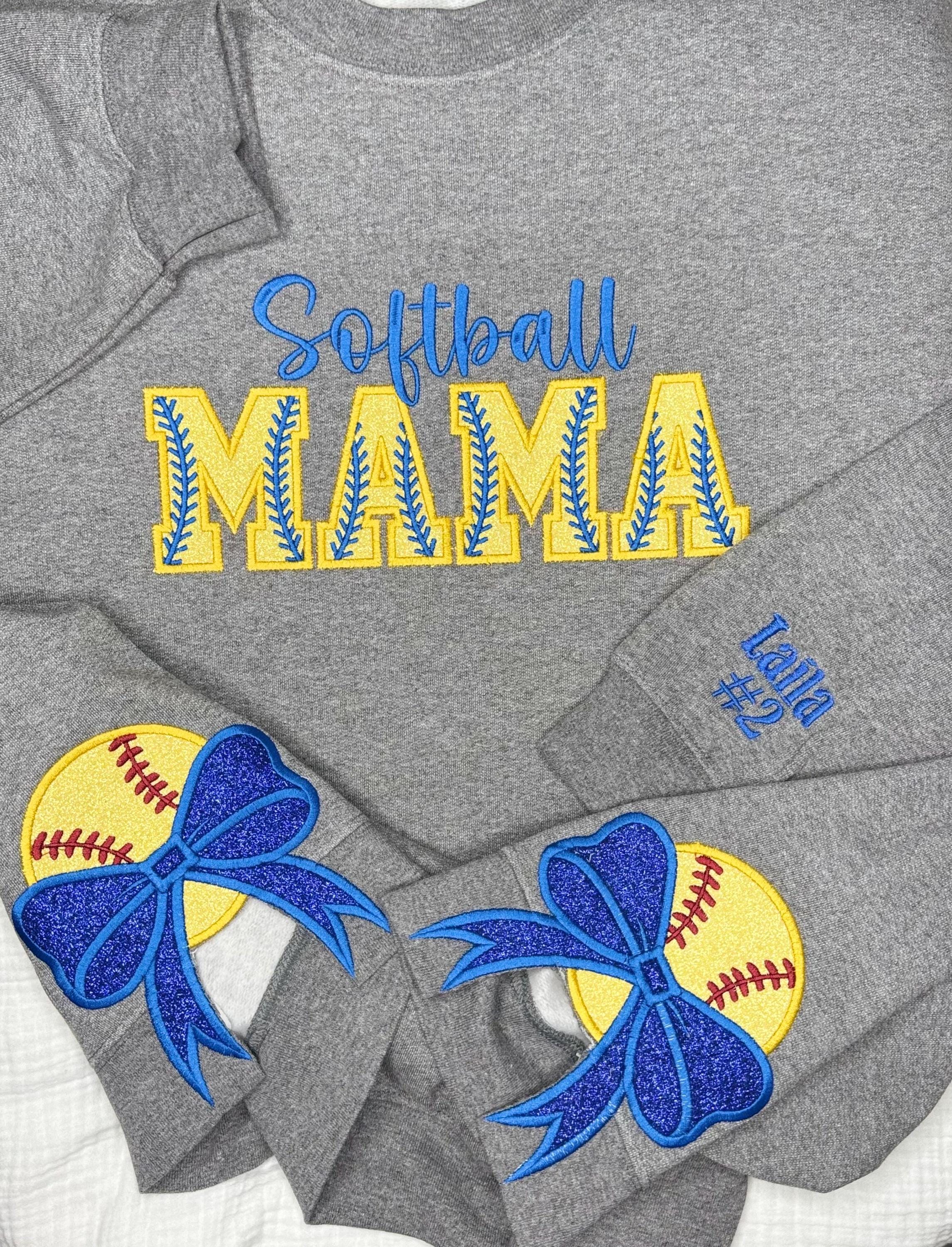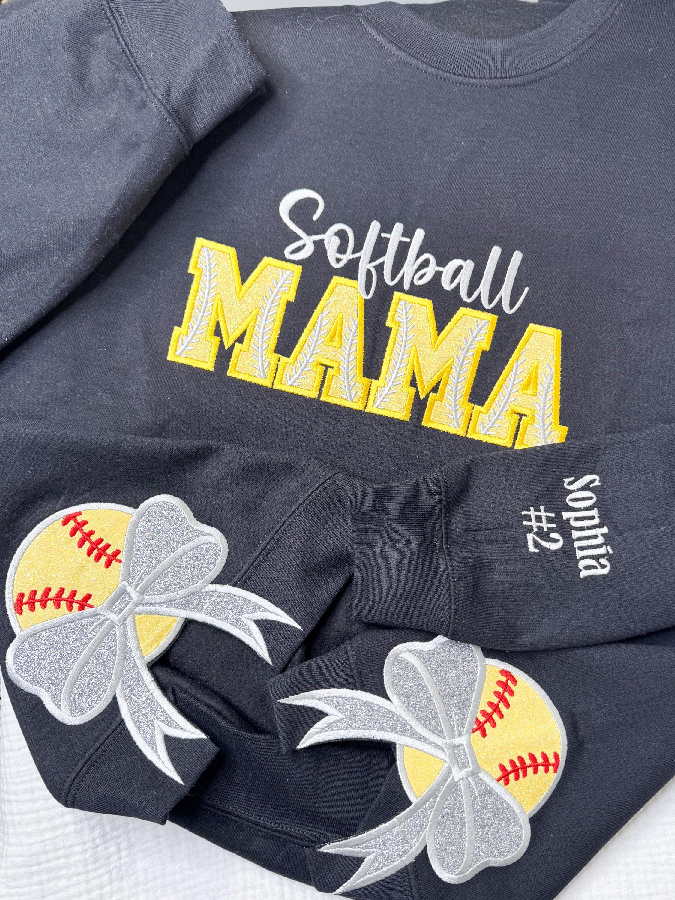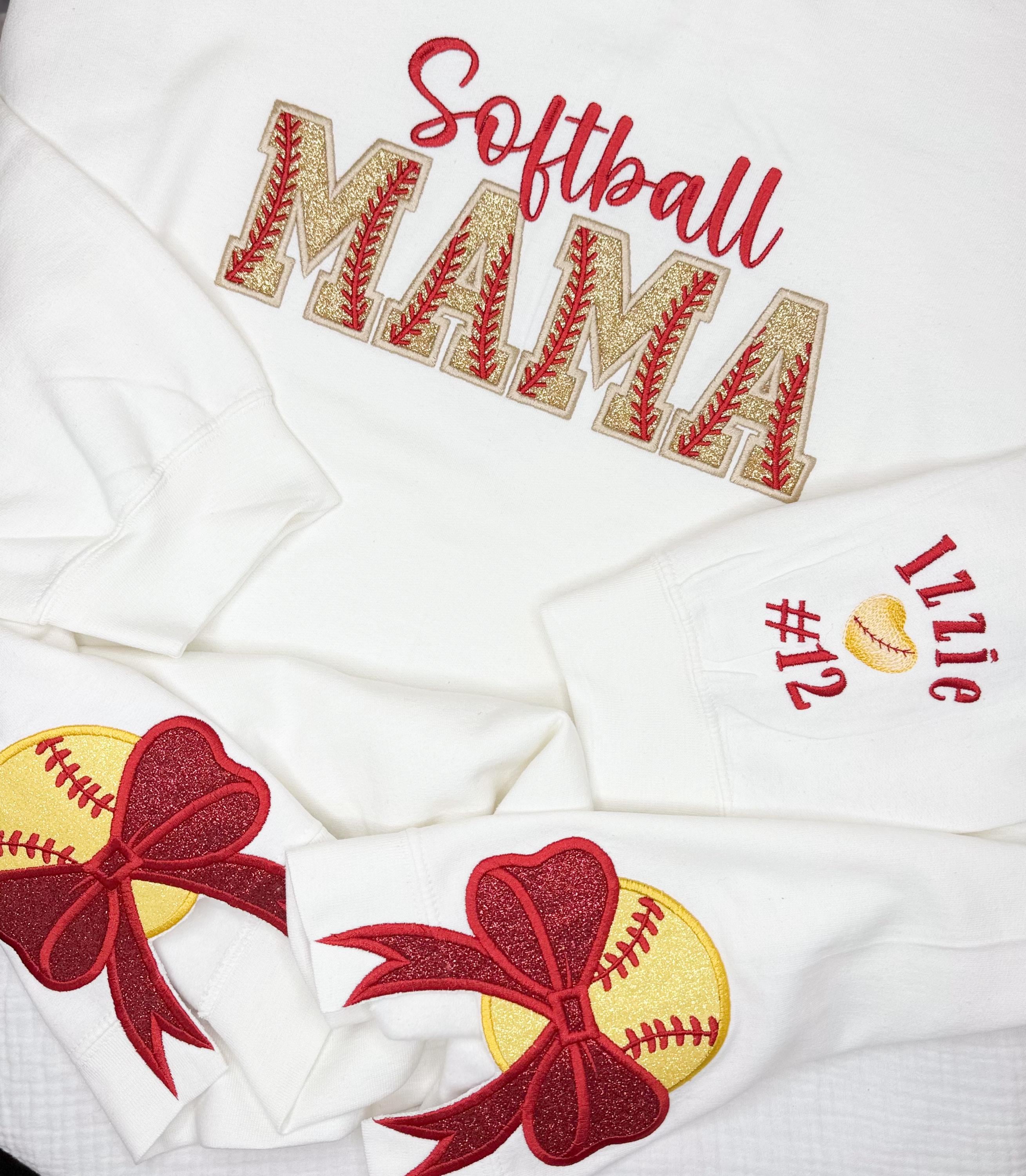 This listing is for crewneck sweatshirt with softball mama embroidered and appliquéd on the chest with softball side bow applique and the players name and number on the sleeve!